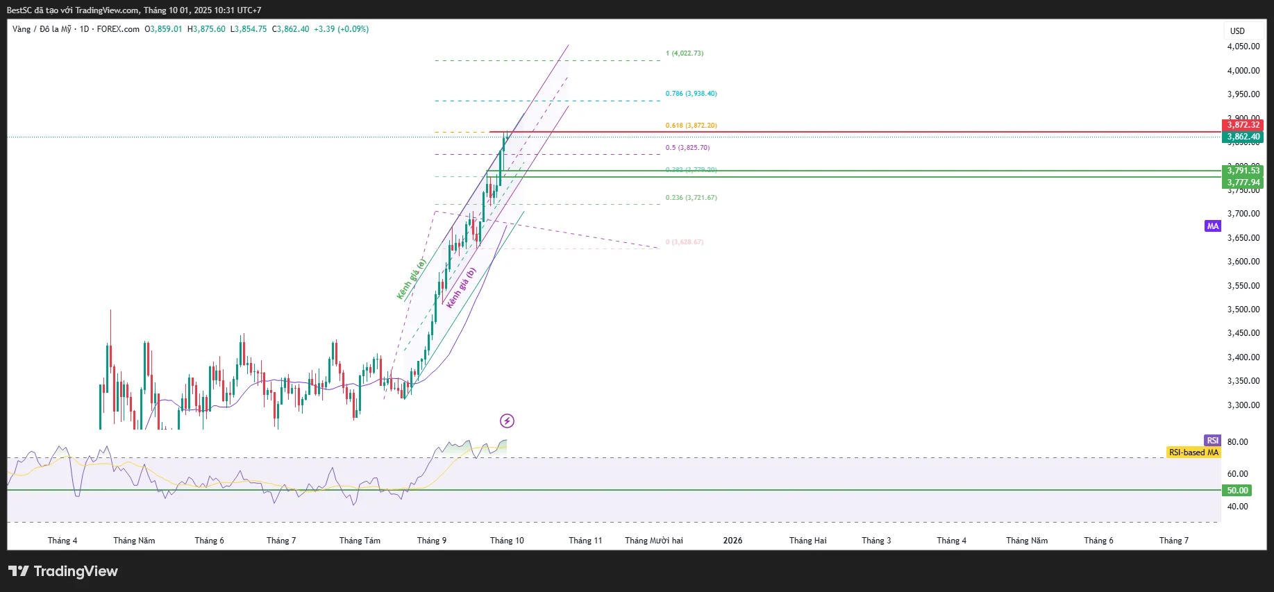 - Kháng cự mạnh: 3.872 – 3.875 USD/oz (Fib 0.618 + vùng chặn tâm lý).