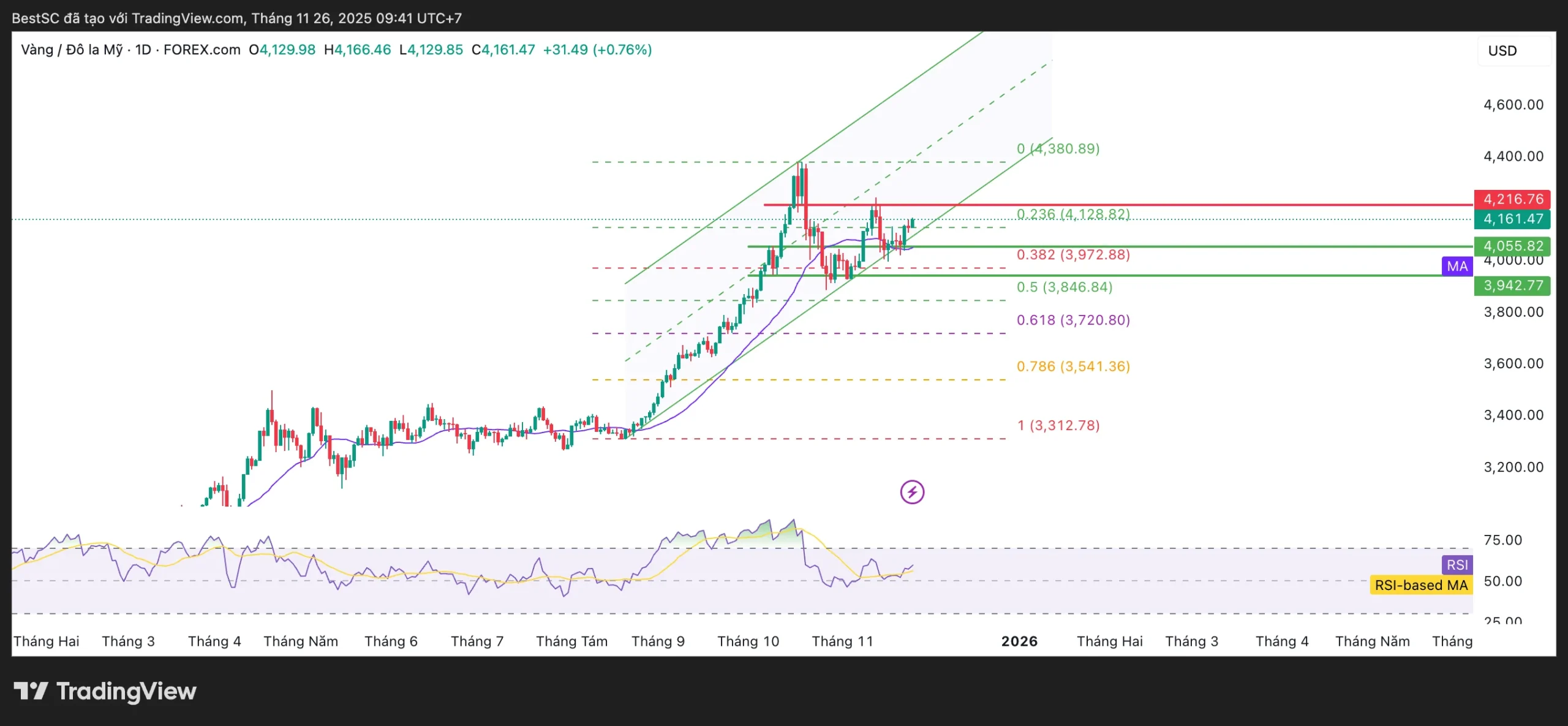 Giá vàng duy trì xu hướng tăng chính trên đồ thị ngày, giao dịch quanh 4.160 USD/oz trong kênh tăng (ascending channel) trung hạn. Giá hiện nằm trên đường MA21 ngắn hạn (~4.056) và đã bật lên từ vùng hỗ trợ quanh Fib 0.382 (≈3.973); RSI đang hồi nhẹ sau vùng trung lập, cho thấy lực bán suy yếu.