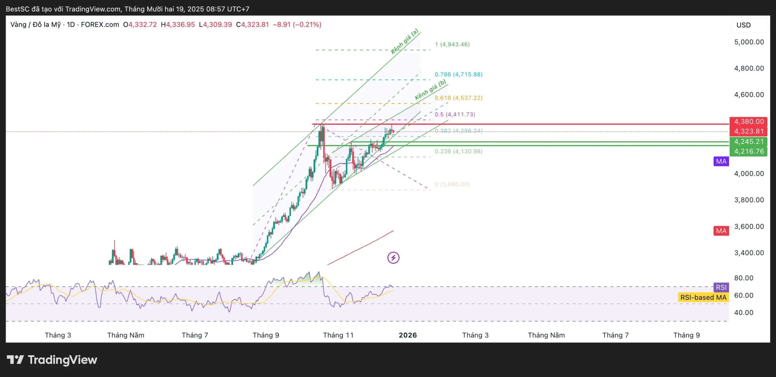 Giá duy trì chuỗi đáy sau cao hơn đáy trước, nằm gọn trong kênh tăng giá trung hạn, cho thấy lực mua nền tảng vẫn đang kiểm soát thị trường. Nhịp điều chỉnh hiện tại diễn ra ngay dưới vùng kháng cự lịch sử 4.380, một hành vi kỹ thuật điển hình sau khi giá tiếp cận đỉnh mọi thời đại.