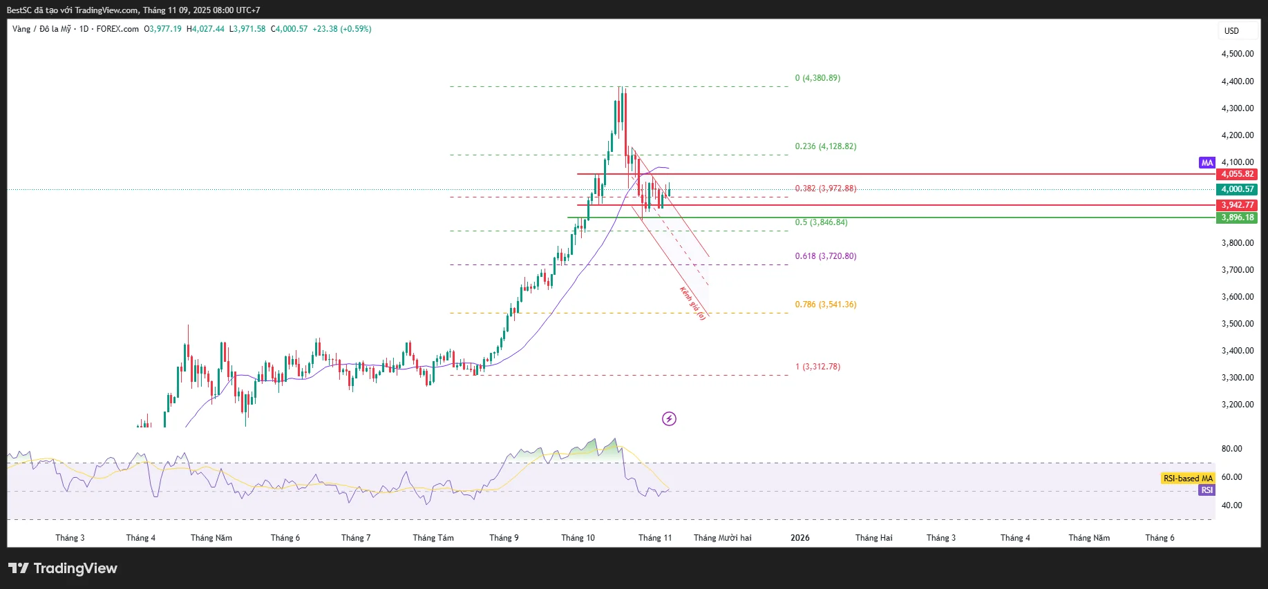 Giá vàng đang trong giai đoạn tích lũy quanh vùng 3.950 – 4.000USD/ ounce, sau khi hoàn tất nhịp điều chỉnh giảm từ đỉnh 4.380 USD. Trên biểu đồ ngày, cấu trúc giá cho thấy xu hướng trung hạn vẫn là tăng, nhưng động lượng ngắn hạn đang yếu đi.