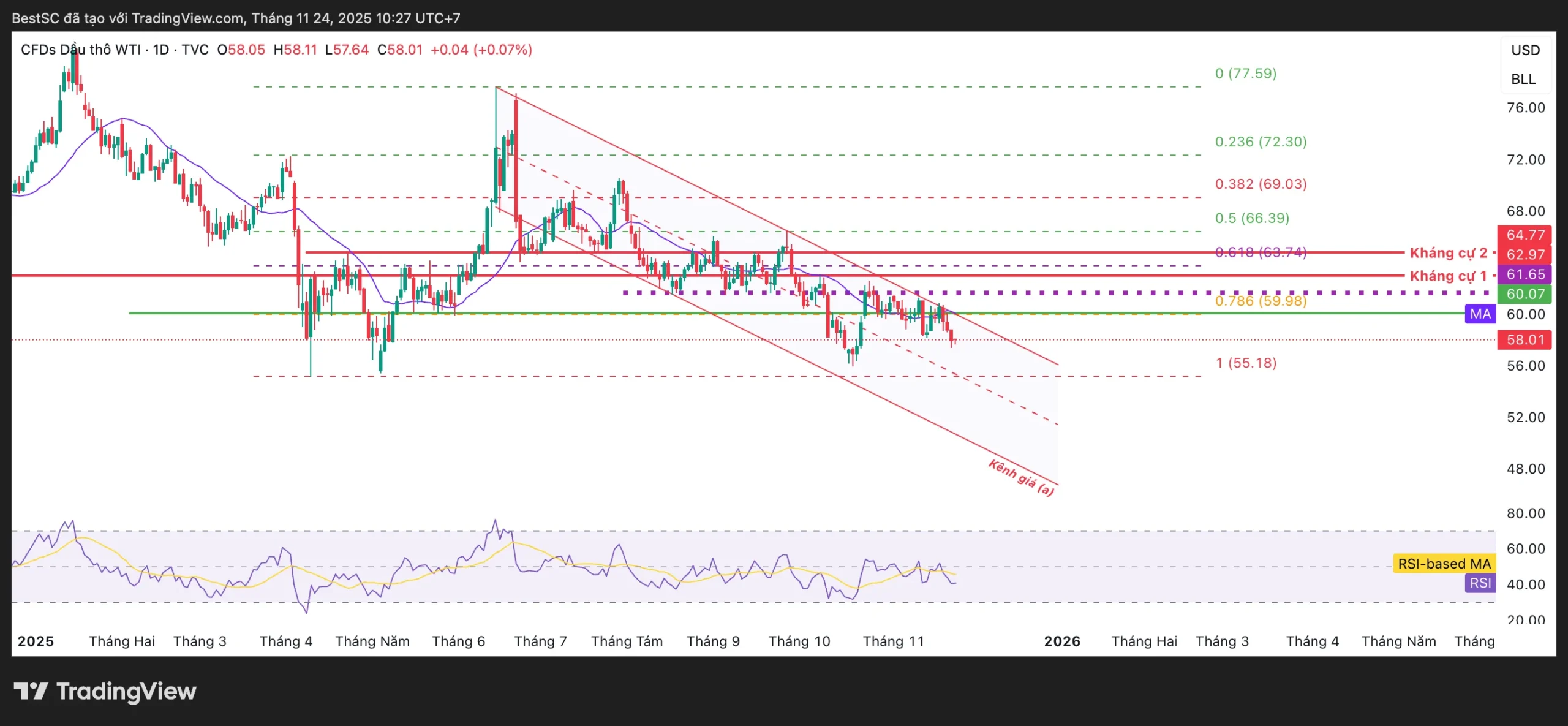 Mẫu hình giá đang mở rộng theo hướng giảm với đáy sau thấp hơn đáy trước; RSI dao động yếu, chưa xuất hiện tín hiệu phân kỳ đảo chiều rõ ràng. Việc thủng vùng 59,98 USD/ thùng (Fib 0,786) củng cố khả năng giá tiếp tục rơi sâu về vùng hỗ trợ 57,60–58,20 USD/ thùng; nếu vùng này bị xuyên thủng, mục tiêu tiếp theo hướng về 55,18 USD/ thùng.