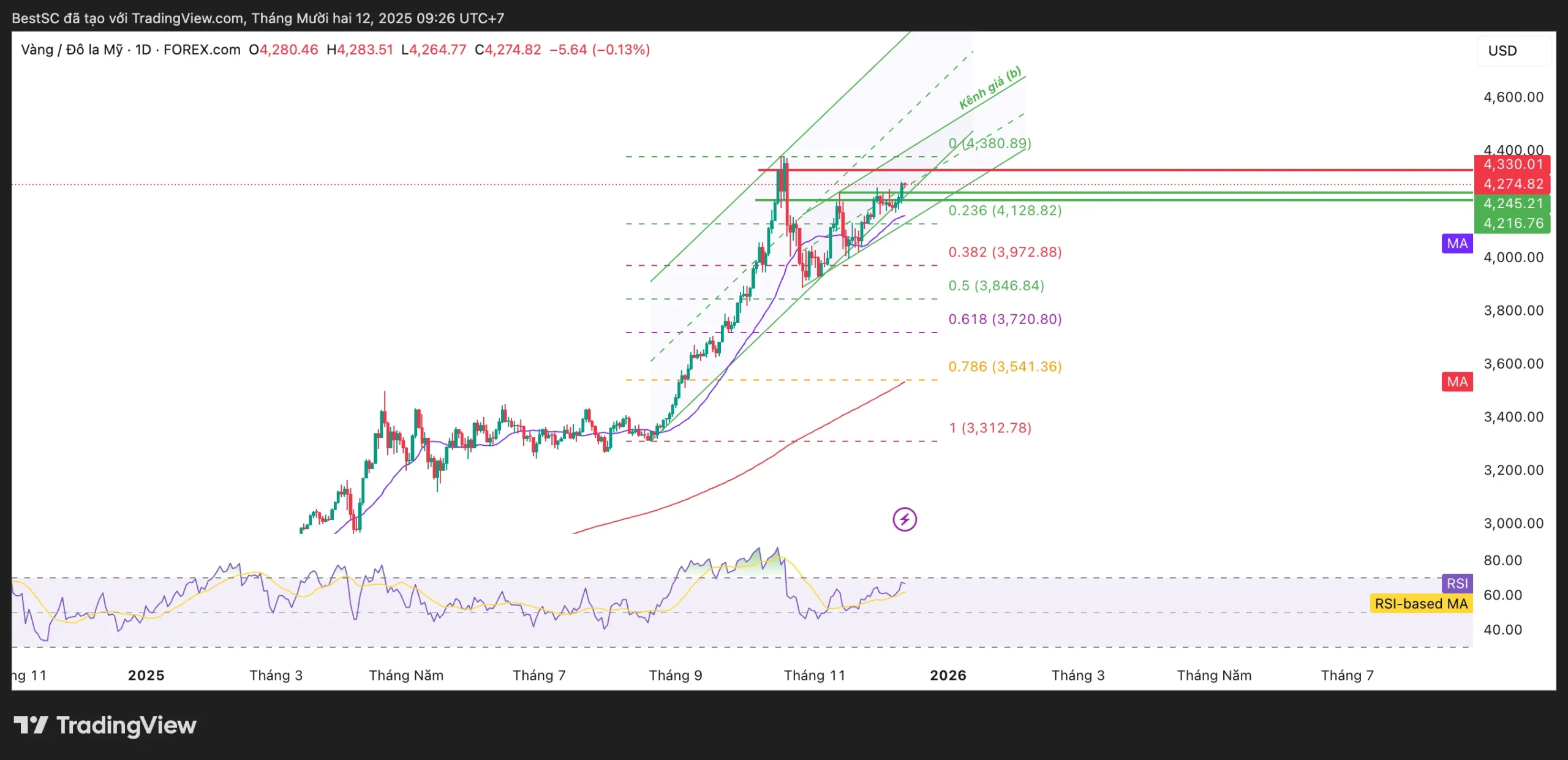 - Target 2: 4.450 – 4.480USD (vùng mở rộng Fibonacci và cạnh trên kênh tăng)