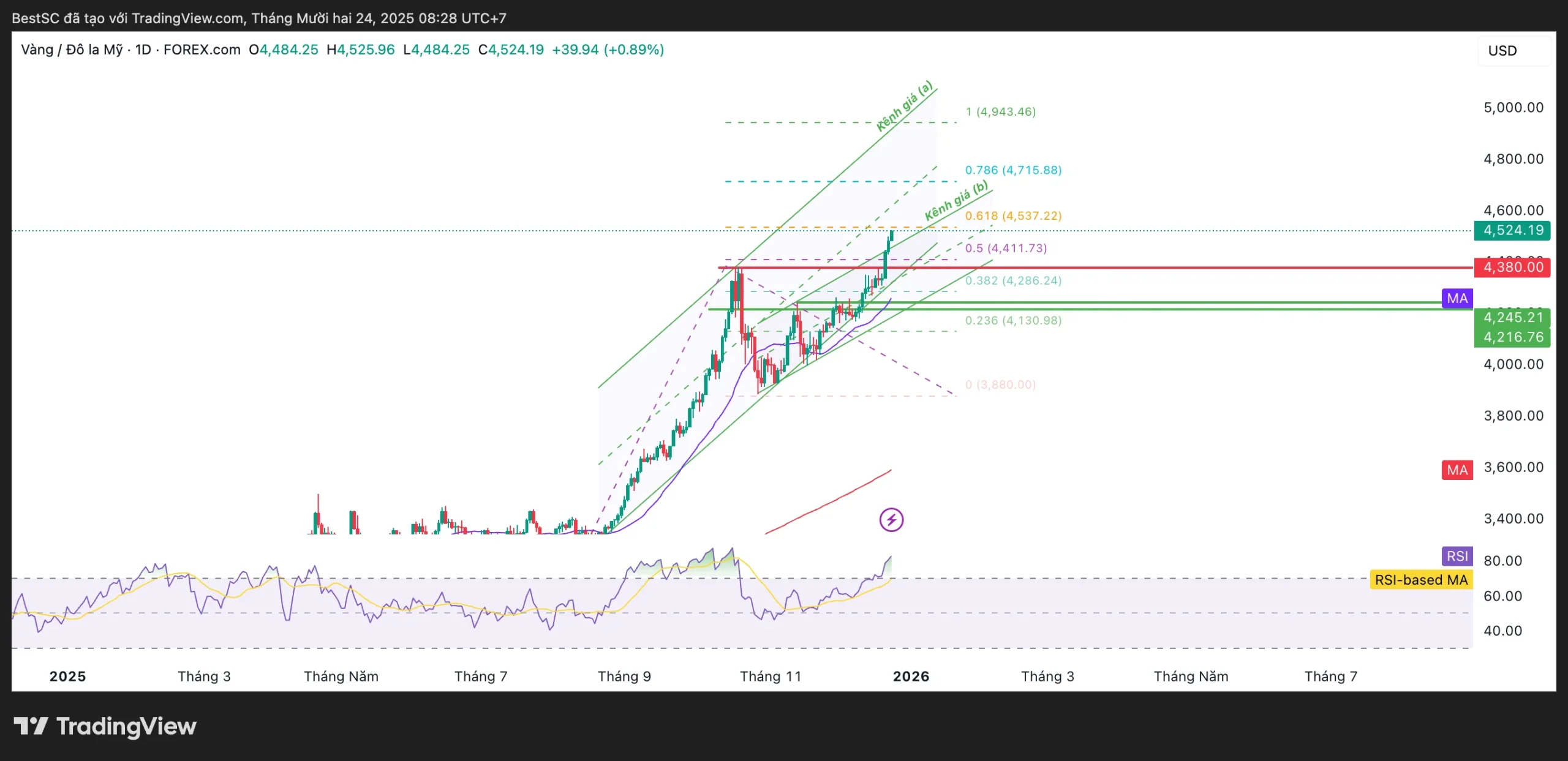 Vàng đang bước vào cuối năm trong trạng thái rất hiếm gặp: giá liên tục thiết lập đỉnh mới trong khi cấu trúc tăng trung, dài hạn vẫn được giữ nguyên. Trên khung ngày, xu hướng tăng chính không chỉ được duy trì mà còn được củng cố rõ ràng khi giá bứt hẳn lên trên vùng đỉnh cũ 4.380 USD/ ounce và đóng cửa ổn định phía trên vùng này.