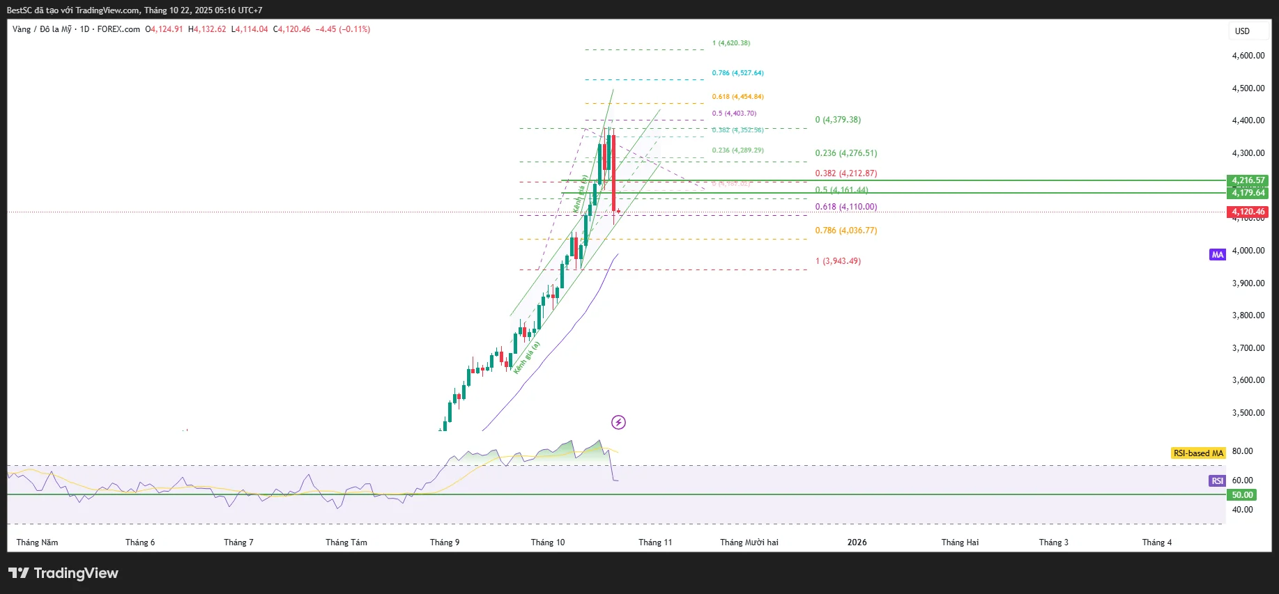 Biểu đồ ngày của vàng, cho thấy sau nhịp tăng mạnh lên vùng đỉnh quanh 4.380 – 4.400USD/ ounce, giá đã bước vào pha điều chỉnh kỹ thuật khá sâu, chạm về vùng hỗ trợ Fibonacci 0.618 quanh 4.110USD/ ounce tương ứng với đường EMA21. Cây nến giảm mạnh đã được hấp thụ một phần, cho thấy lực bán đang suy yếu và động lượng giảm có dấu hiệu chững lại.