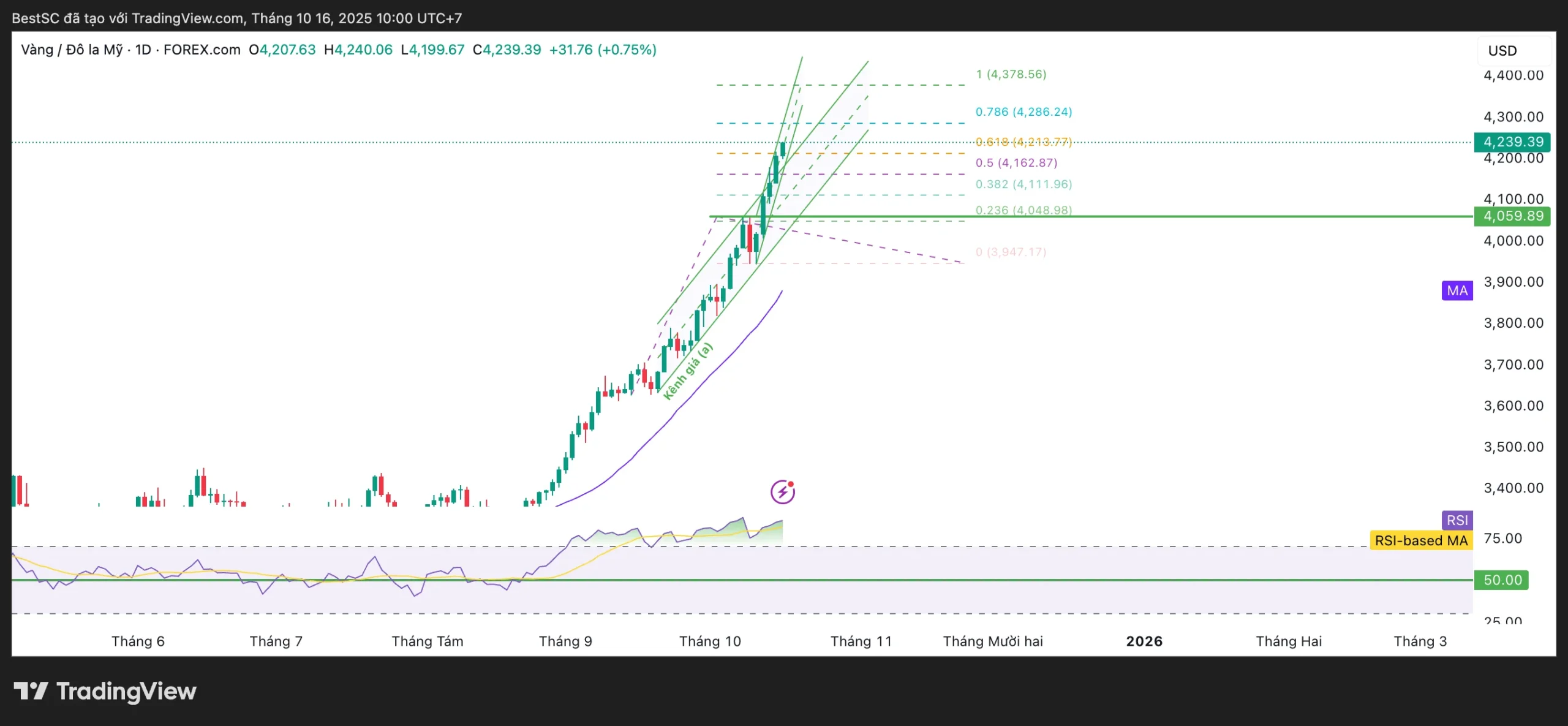 Giá vàng giao ngay tiếp tục duy trì xu hướng tăng mạnh, hiện giao dịch quanh 4.239 USD/ ounce, tăng gần 0,75% trong ngày và đang tiến sát vùng kháng cự Fib 0,618 tại 4.213 – 4.286 đô la, tương ứng với đỉnh kênh tăng giá ngắn hạn.