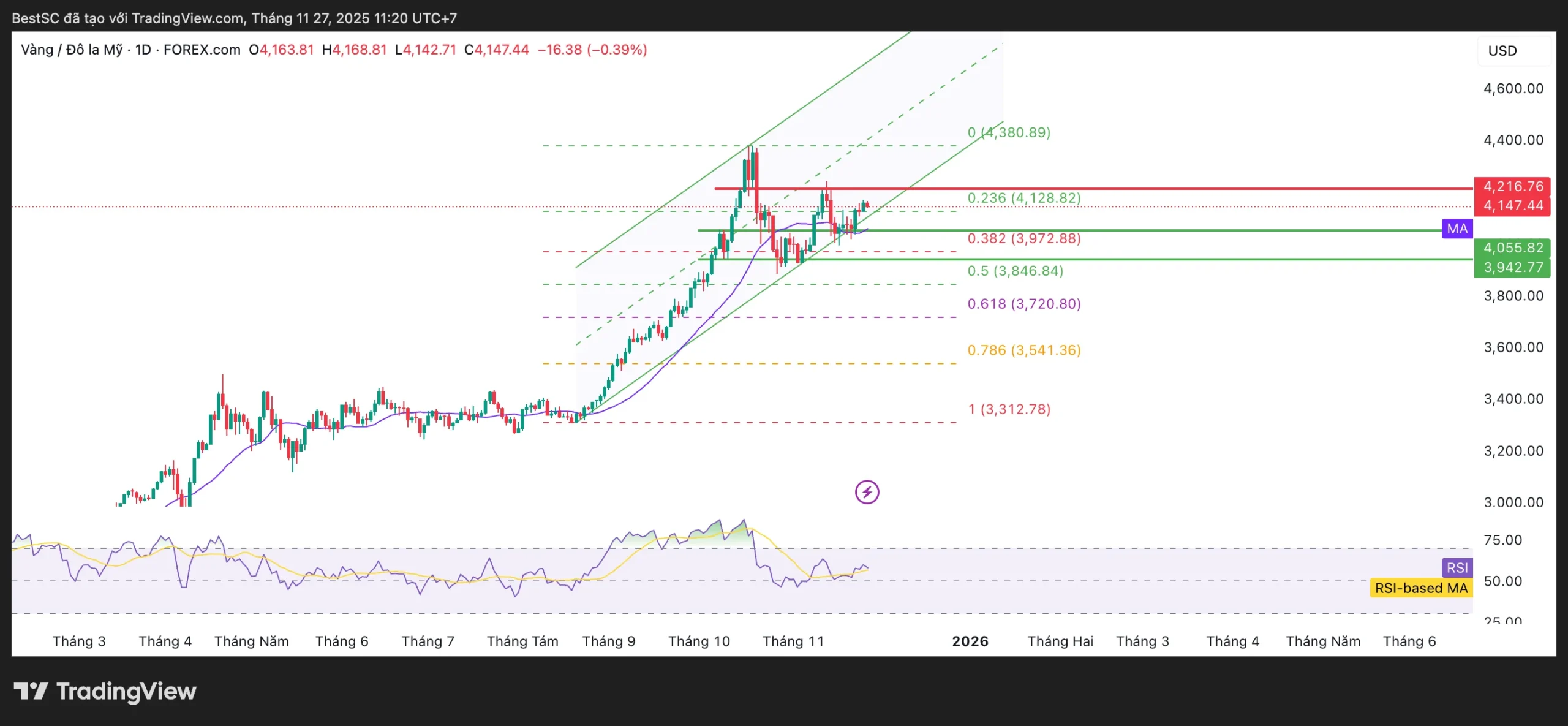 - Hỗ trợ quan trọng: 3,972–4,000 USD (Fib 0.382 + biên dưới kênh/MA21) nếu giữ được, triển vọng tăng duy trì.