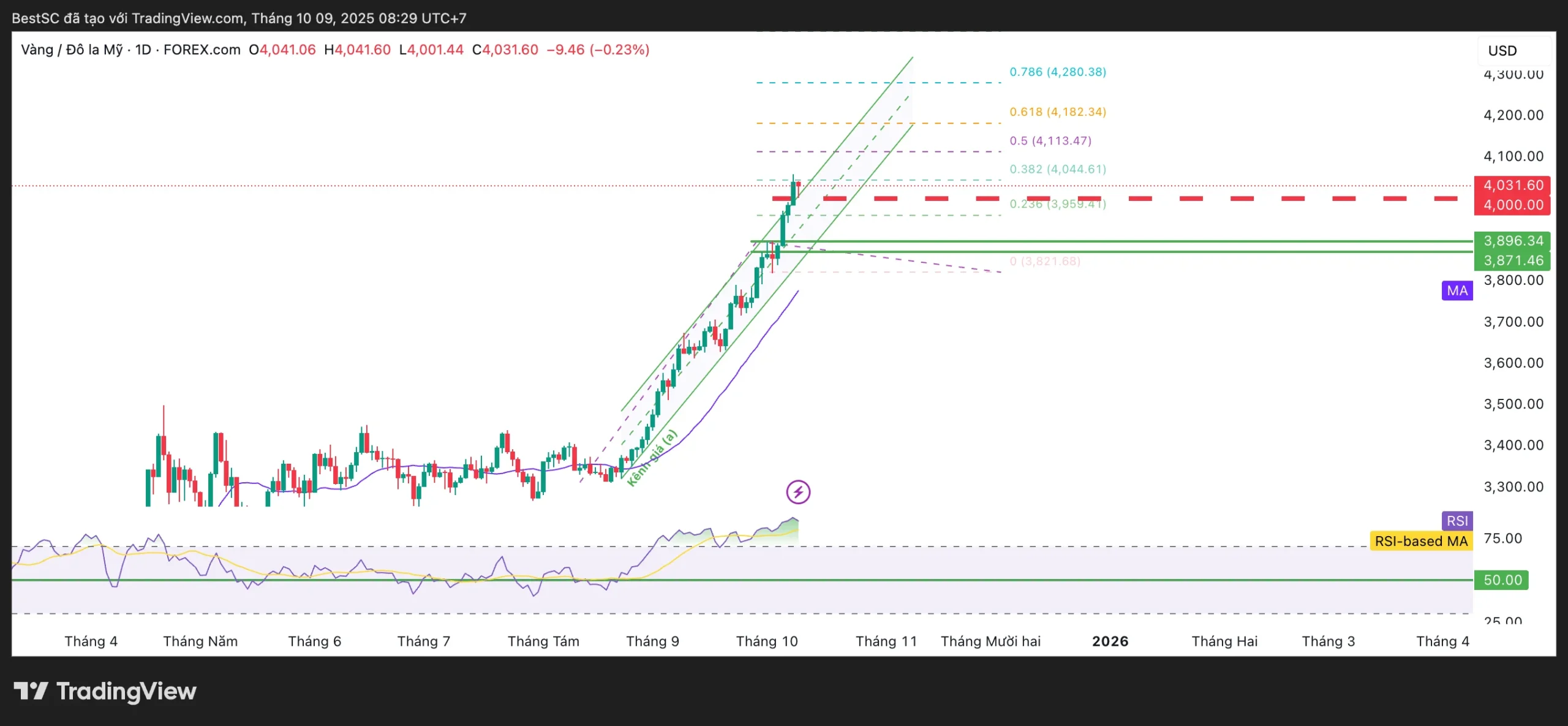 • Kháng cự ngắn hạn: 4.044 /SD (Fib 0.382) và vùng 4.110–4.180 USD (Fib 0.5–0.618). Đây là vùng cản quan trọng trong ngắn hạn.