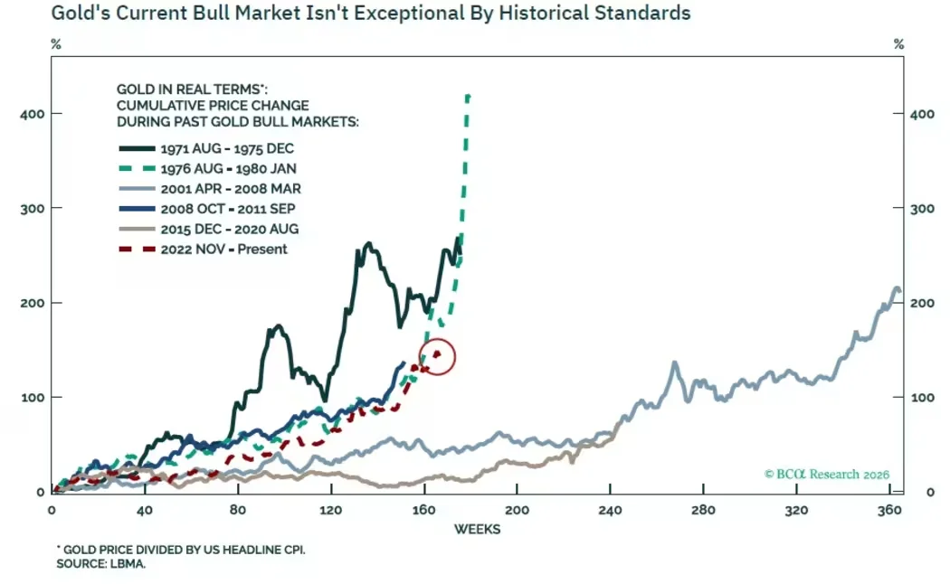 Quan trọng hơn, khi đặt thị trường hiện tại vào bối cảnh lịch sử, bức tranh trở nên bớt cực đoan hơn nhiều. Theo BCA Research, đợt tăng giá lần này chưa bằng về quy mô lẫn thời gian so với các chu kỳ tăng lớn trong giai đoạn 1970–1980. Xét trên khung dài hạn, thị trường giá lên của vàng hiện tại vẫn đang ở giai đoạn tương đối sớm.