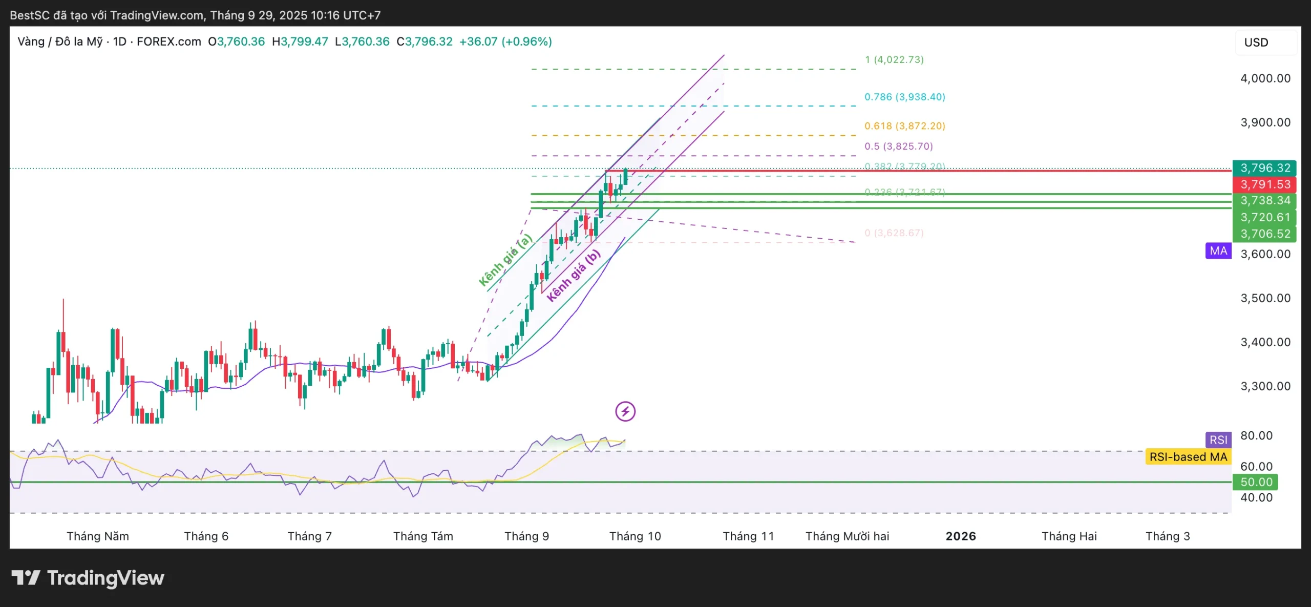 - Hiện tại giá vừa test vùng 3.799 – 3.800 USD/ounce, sát kháng cự Fibonacci 0.382 (3.779) và gần mốc tâm lý 3.800.