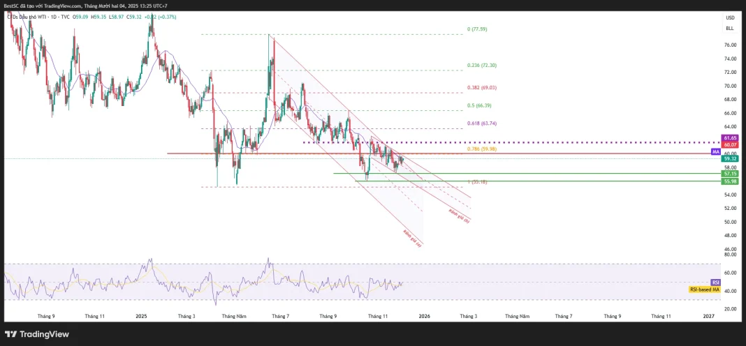 Khung ngày cho thấy xu hướng chính vẫn là giảm/giằng co từ kênh giảm (red channel). giá hiện dao động quanh 59.3 USD/thùng, dưới đường MA21 ngắn hạn (~60.1) và ngay dưới mức fibo 0.786 quanh 59.98 (vùng kháng cự kỹ thuật ngắn hạn).
