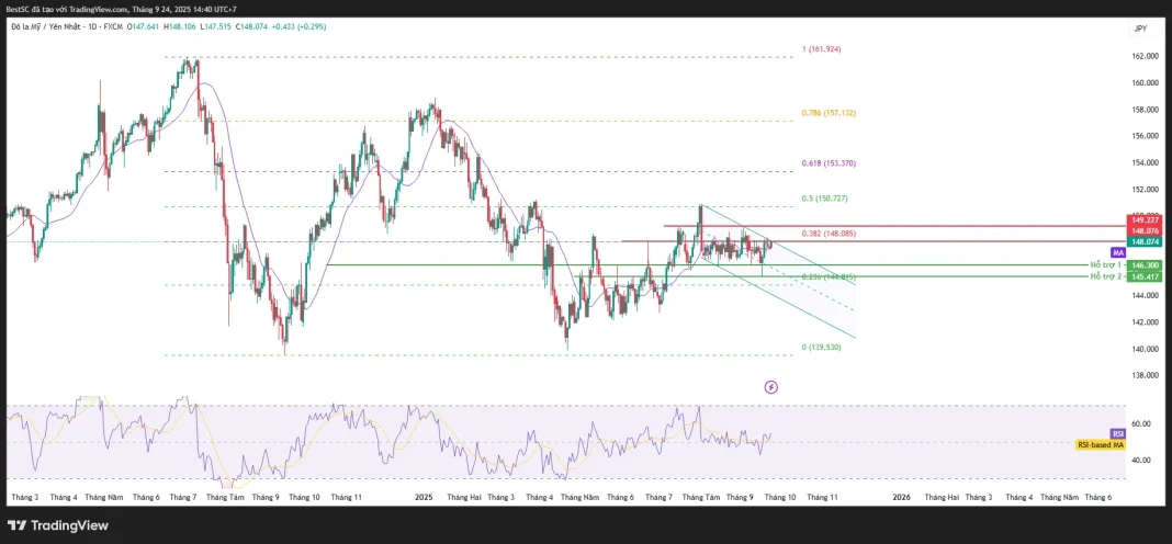 Hiện tại, xu hướng ngắn hạn ngả về tăng, nhưng cần một cú breakout rõ ràng trên 149.2 mới chắc chắn.