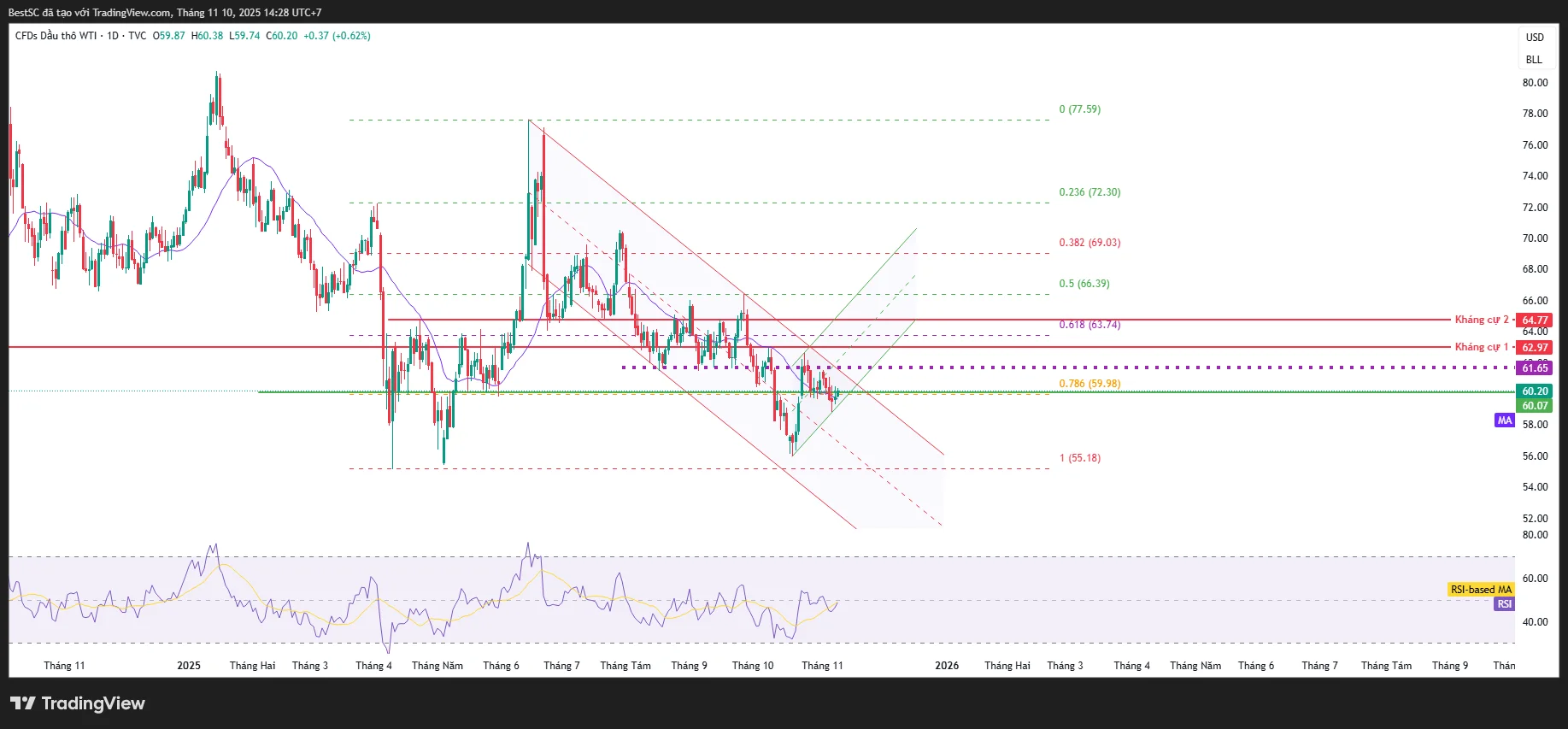 Phục hồi ngắn hạn trong xu hướng giảm trung hạn. Giá WTI hiện giao dịch quanh ~60.2 USD/thùng, vừa bật khỏi vùng đáy ngắn hạn và đang chạy trong một kênh tăng nhỏ (xanh) nằm trong khuôn khổ một kênh giảm lớn (đỏ).