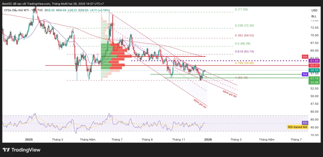 Đáng chú ý, khu vực 59,8–60,5 USD/thùng đang đóng vai trò là vùng kháng cự then chốt: đây là nơi hội tụ của Fibonacci 0,786, đường MA trung hạn và cạnh trên của kênh giá giảm. Việc giá chưa thể đóng cửa dứt khoát phía trên vùng này cho thấy phe bán vẫn kiểm soát xu hướng.