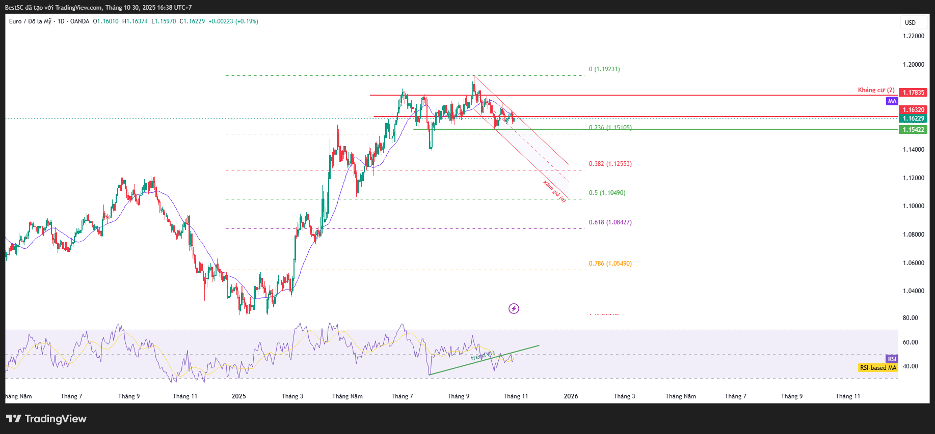 Về Fibonacci, giá đang dao động quanh vùng 0.236 (1.1510) – đây là vùng hỗ trợ tương đối mạnh, trùng với đáy gần nhất tháng 9. Ngay bên dưới là vùng 1.1540–1.1500, được xem là “hàng rào phòng thủ” quan trọng.