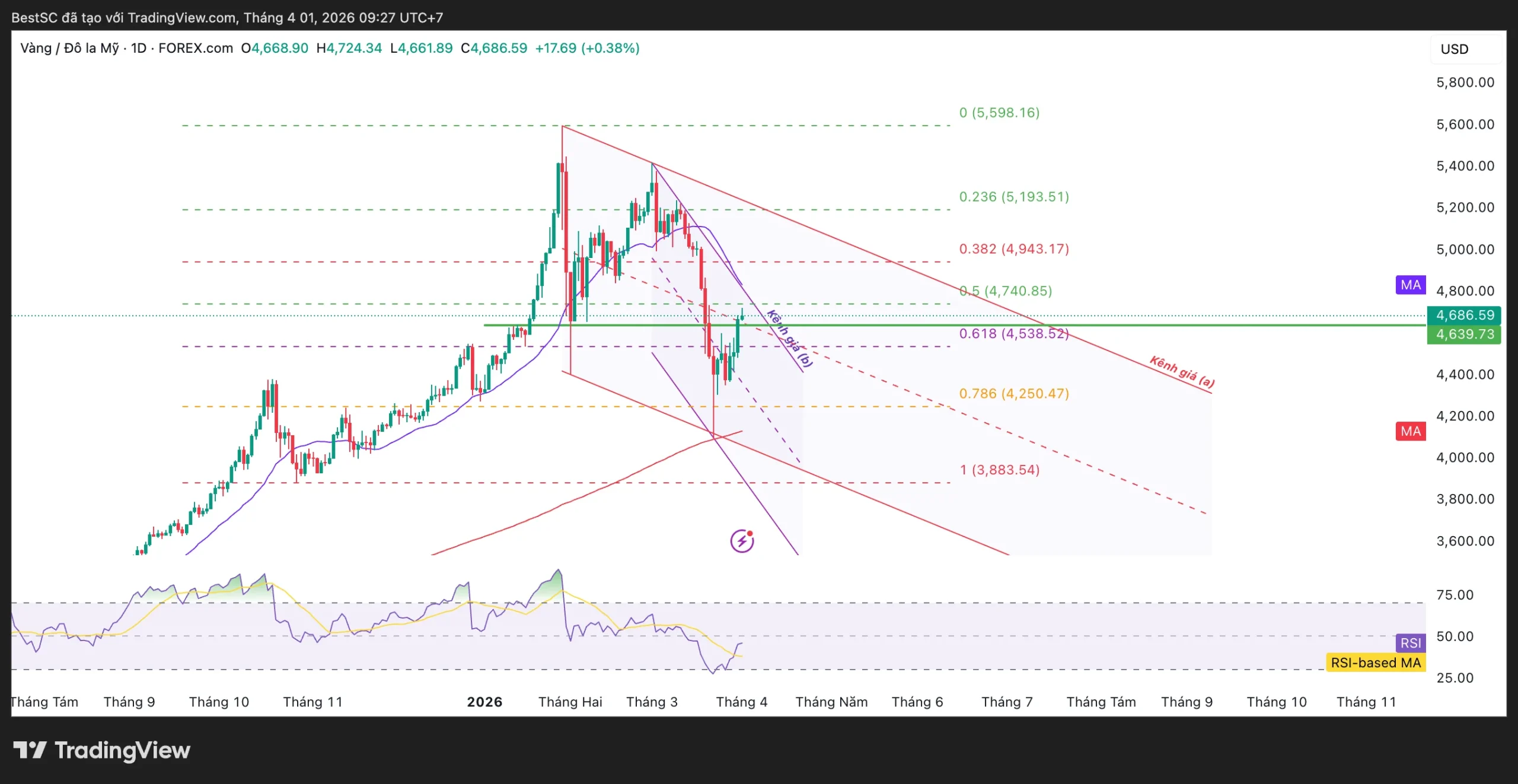 Tuy nhiên, để xác nhận một chu kỳ tăng mới thực sự hình thành, thị trường cần thêm hai điều kiện mang tính quyết định: phá vỡ dứt khoát mức Fibonacci 0.5 quanh 4.740USD và đồng thời breakout lên trên kênh giá giảm (kênh b). Khi 2 yếu tố này hội tụ, cấu trúc giảm trước đó sẽ bị vô hiệu, mở ra dư địa cho một nhịp tăng bền vững hơn.