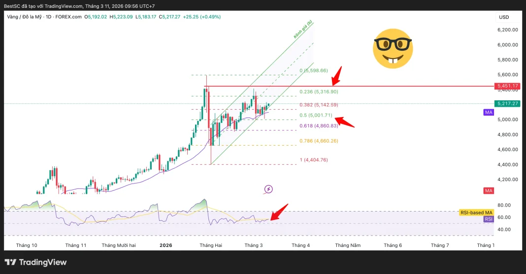 Sau nhịp điều chỉnh mạnh từ vùng đỉnh gần đây, giá vàng đang cho thấy dấu hiệu ổn định và phục hồi dần trong cấu trúc xu hướng tăng trung hạn. Trên biểu đồ ngày, giá hiện giao dịch quanh 5.217USD, vẫn duy trì phía trên vùng Fibonacci thoái lui 0.382 tại khoảng 5.142 USD, đồng thời được hỗ trợ bởi đường trung bình động EMA21 đang dốc lên.