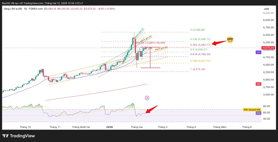 Sau nhịp tăng mạnh đầu năm, vàng đang bước vào giai đoạn điều chỉnh – tích lũy trong biên độ hẹp, thay vì đảo chiều giảm. Biểu đồ cho thấy giá đang dao động quanh vùng Fibonacci 0.382, tương ứng khu vực 5.090 – 5.100USD, đây là vùng kháng cự kỹ thuật quan trọng của nhịp hồi hiện tại.