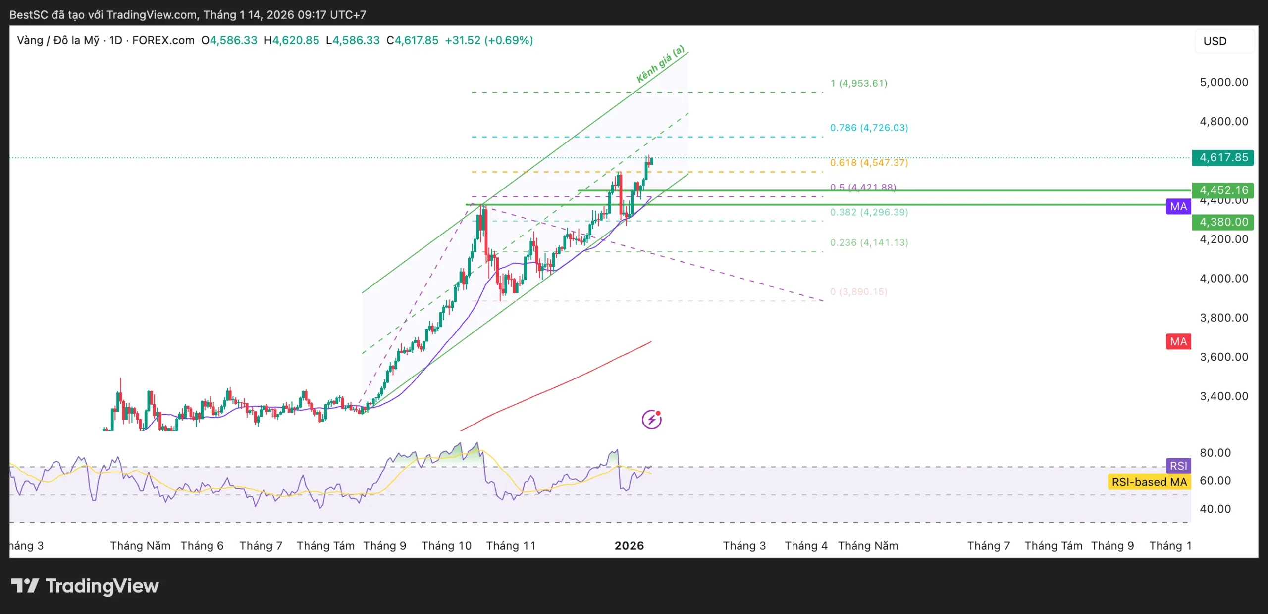 Rủi ro điều chỉnh vẫn tồn tại, đặc biệt khi giá tiếp cận các vùng mục tiêu. Tuy nhiên, trong bối cảnh xu hướng chính chưa bị phá vỡ, các nhịp giảm về khu vực 4.450–4.420 hoặc sâu hơn là 4.300–4.280 (Fibo 0,382) nên được nhìn nhận như các điểm tái định vị vị thế mua, hơn là tín hiệu đảo chiều.