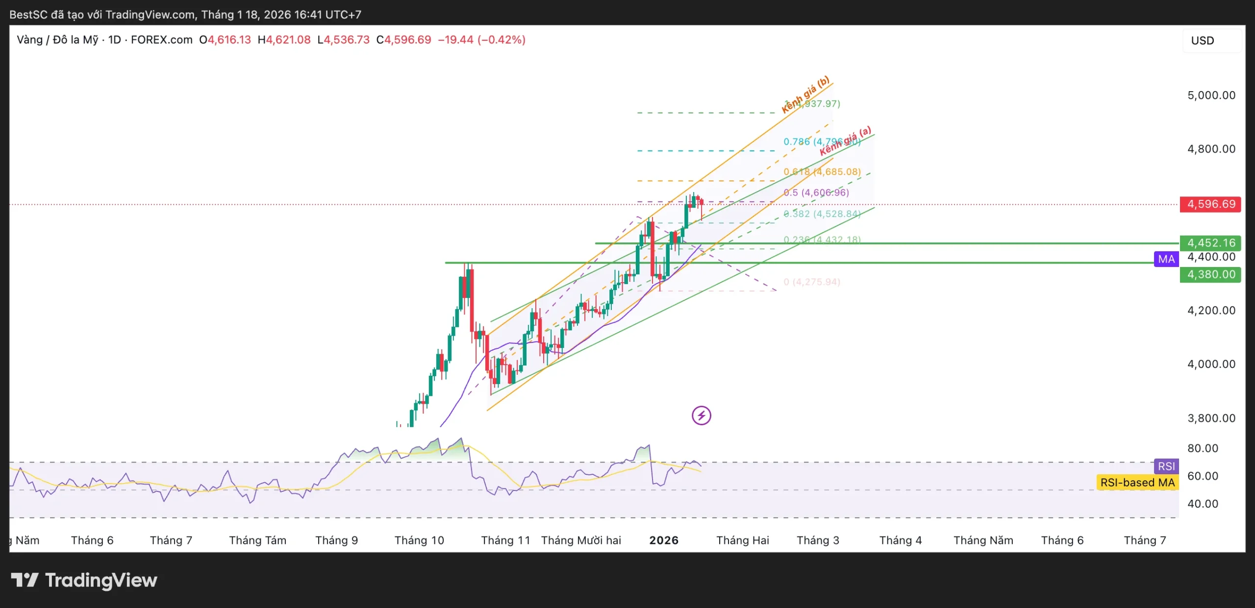 - Vùng hỗ trợ gần: 4.520–4.540 USD (vùng Fibonacci 0,382 và cạnh dưới kênh tăng).
