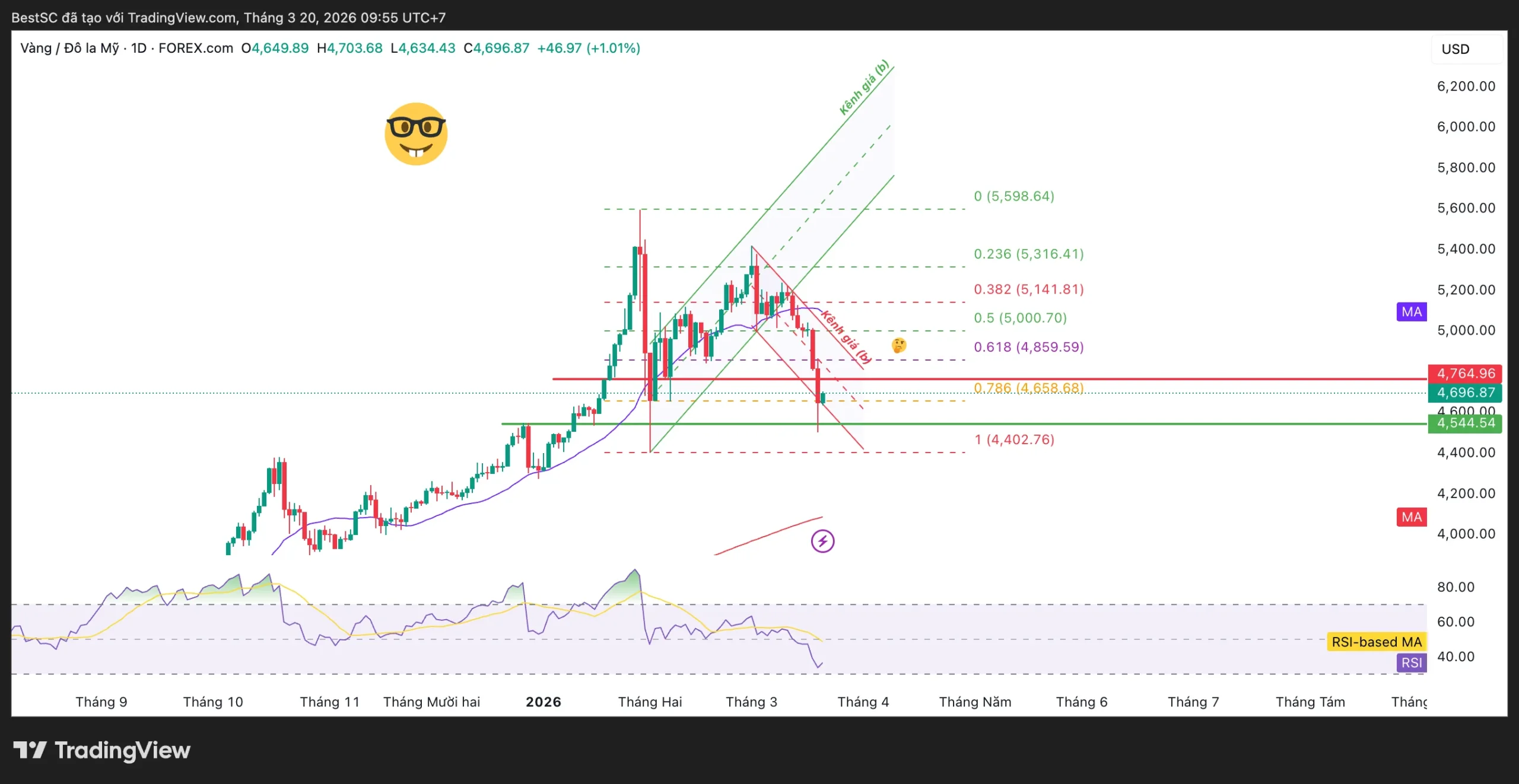 Trong khi đó, hỗ trợ gần nhất là 4.658USD (Fib 0.786) đang là “ranh giới cuối” giữ cấu trúc hiện tại.