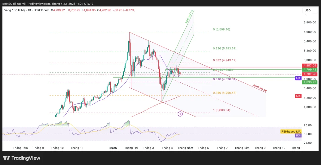 - Giảm giá: Nếu phá vỡ dứt khoát xuống dưới EMA21 và vùng hỗ trợ 4.640USD, cấu trúc tích lũy sẽ bị phá vỡ, mở ra khả năng điều chỉnh sâu về 4.538USD (Fibo 0.618), thậm chí 4.250USD trong kịch bản tiêu cực hơn.