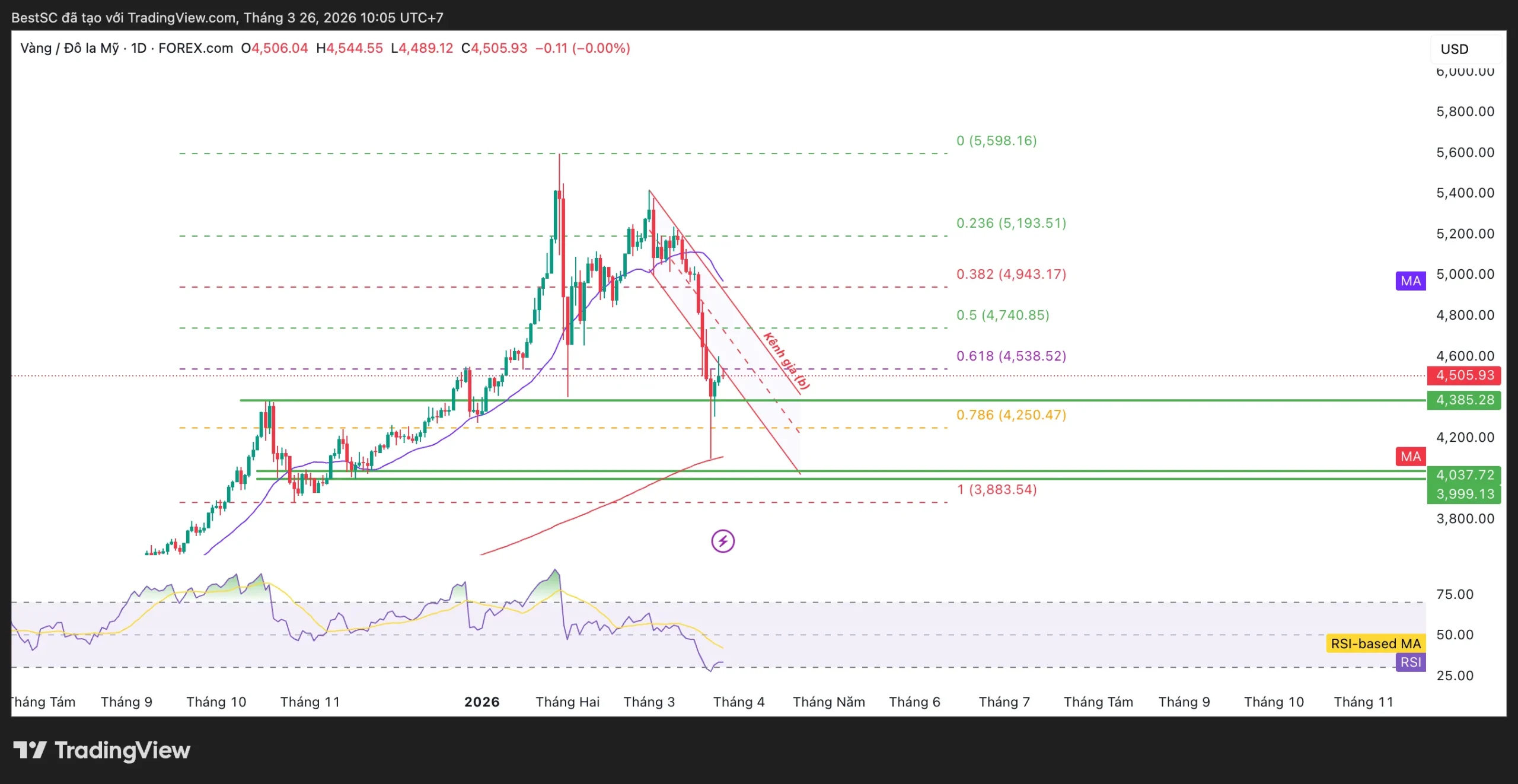 Ngược lại, rủi ro lớn nhất nằm ở việc giá đánh mất mốc 0.618. Khi đó, toàn bộ nhịp hồi hiện tại sẽ bị xem là pullback trong xu hướng giảm, và giá có thể nhanh chóng quay lại kiểm định vùng 4.385USD (Fib 0.786), sâu hơn là vùng 4.037–3.999USD (hỗ trợ cứng + MA dài hạn). RSI vẫn đang ở vùng thấp cho thấy lực bán chưa hoàn toàn bị triệt tiêu, đồng nghĩa với việc kịch bản giảm vẫn chưa bị vô hiệu.