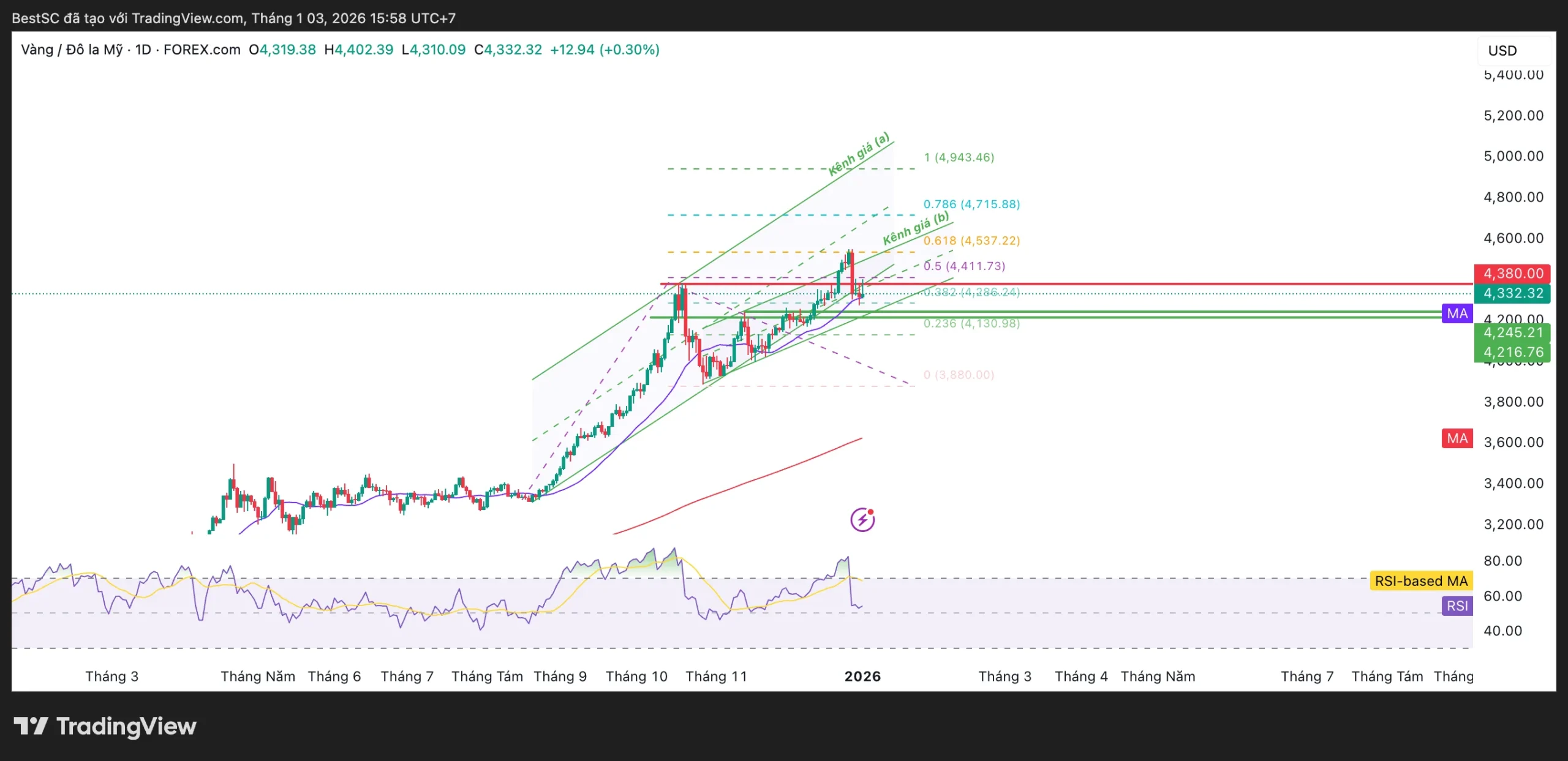 Giá vàng đang bước vào giai đoạn tạm dừng nhịp tăng, nhưng cấu trúc xu hướng lớn chưa hề bị phá vỡ. Sau cú bứt phá mạnh cuối năm 2025, vàng đã điều chỉnh từ vùng Fibonacci 0.618–0.786 và hiện dao động tích lũy ngay trên cụm hỗ trợ động quanh EMA21, quanh khu vực 4.28x–4.33x USD.