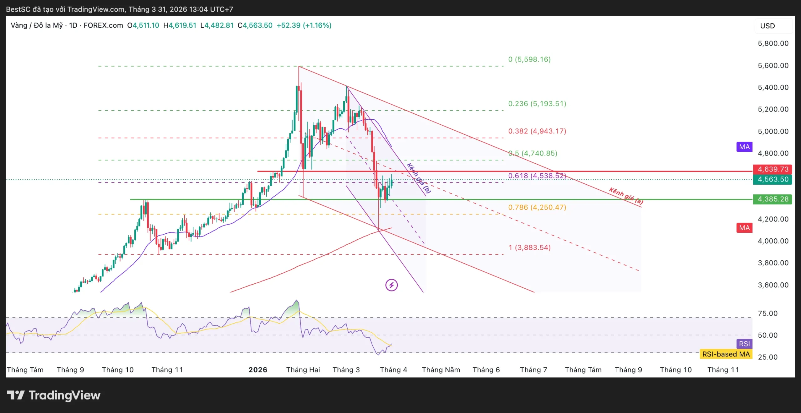 Nếu điều kiện này được thỏa mãn, nhịp phục hồi ngắn hạn có thể mở rộng lên các mốc Fibonacci cao hơn, trước mắt là Fib 0.5 quanh 4.740USD, sau đó là Fib 0.382 tại 4.943USD và xa hơn là vùng 5.190USD của Fib (0.236) tương ứng với vùng hồi kỹ thuật sâu hơn trong xu hướng giảm trước đó.