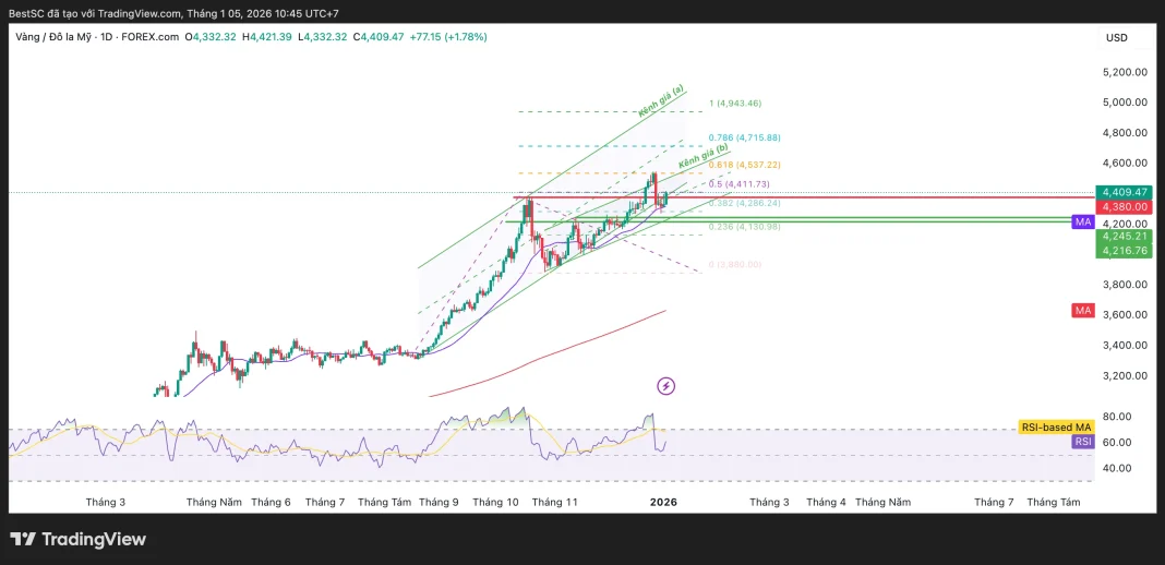 Biểu đồ ngày của giá vàng cho thấy xu hướng tăng trung – dài hạn vẫn đang được bảo toàn một cách rõ ràng. Sau nhịp tăng mạnh từ vùng tích lũy cuối năm 2025, giá duy trì vận động trong kênh tăng dốc lên, với cấu trúc đỉnh sau cao hơn đỉnh trước, đáy sau cao hơn đáy trước, đặc trưng của một xu hướng tăng khỏe.