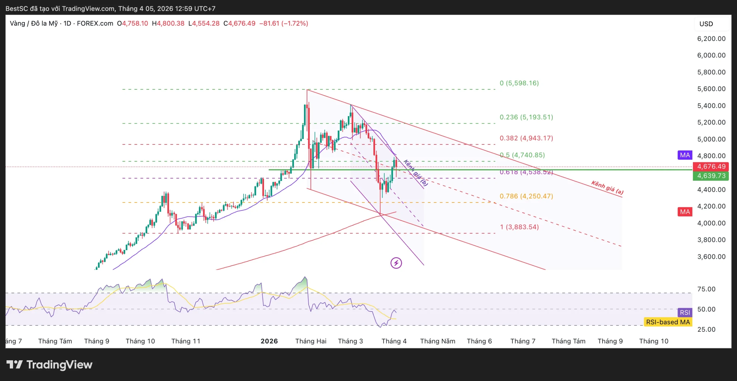 Giá vàng đang trong pha hồi kỹ thuật sau nhịp giảm mạnh, nhưng cấu trúc tổng thể vẫn là giảm trong kênh giá (b). Vùng hội tụ quan trọng nằm quanh Fibonacci 0.50 (~4.740USD), EMA21 và cạnh trên kênh giá, hiện đóng vai trò là “cụm kháng cự quyết định”. Chỉ khi giá đóng cửa rõ ràng phía trên vùng này, một chu kỳ tăng mới mới có cơ sở hình thành, khi đó động lượng sẽ được xác nhận lại.