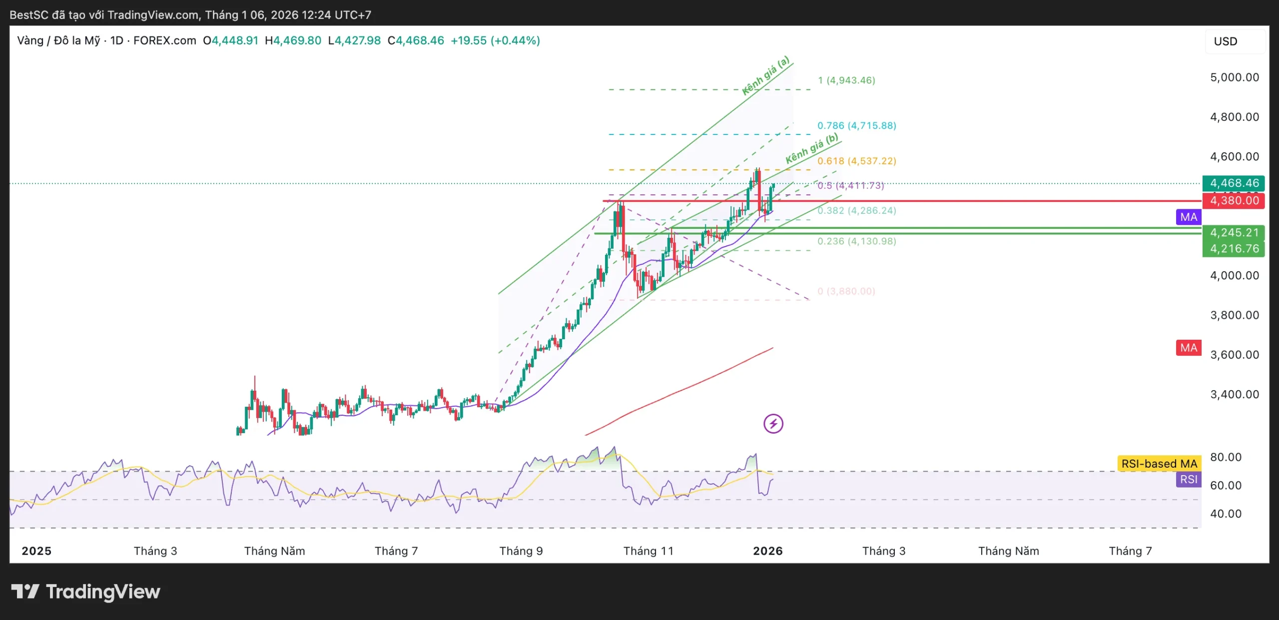 Rủi ro điều chỉnh ngắn hạn vẫn tồn tại, chủ yếu đến từ chốt lời kỹ thuật sau chuỗi phiên tăng mạnh. Một nhịp lùi về vùng 4.380–4.350 USD không làm thay đổi xu hướng, miễn là giá còn trụ vững trên vùng hỗ trợ này. Chỉ khi mất mốc hỗ trợ nói trên, thị trường mới đối diện nguy cơ mở rộng điều chỉnh về sâu hơn, nơi đường trung bình trung hạn đang hội tụ.