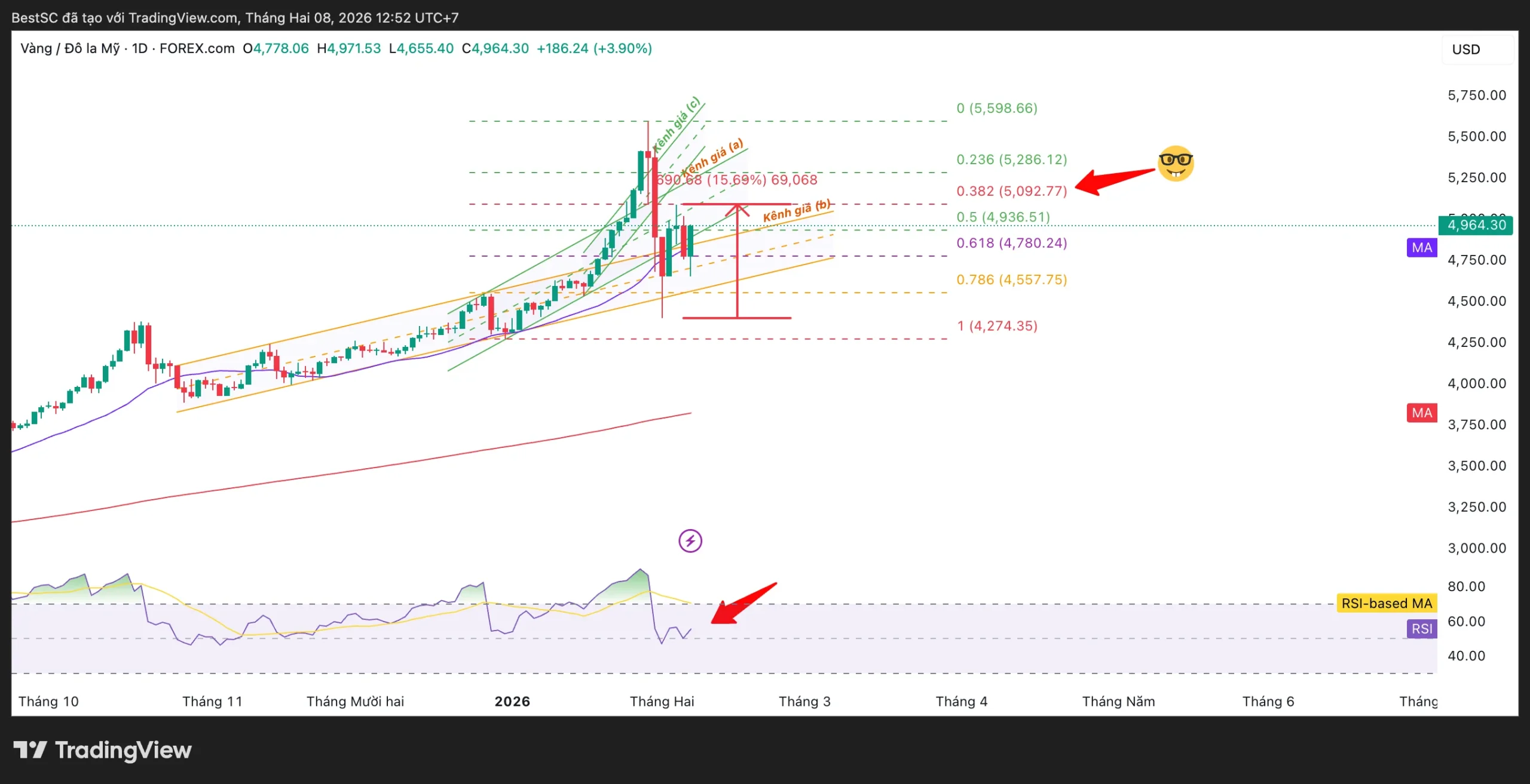 Về cấu trúc giá, vàng đã rơi khỏi kênh tăng dốc (kênh giá a) sau cú điều chỉnh mạnh đầu tháng 2, nhưng chưa phá vỡ cấu trúc xu hướng tăng trung hạn. Hiện tại, giá đang dao động trong kênh giá hồi phục (kênh b), một dạng điều chỉnh mang tính kỹ thuật, thường xuất hiện giữa các nhịp tăng lớn.