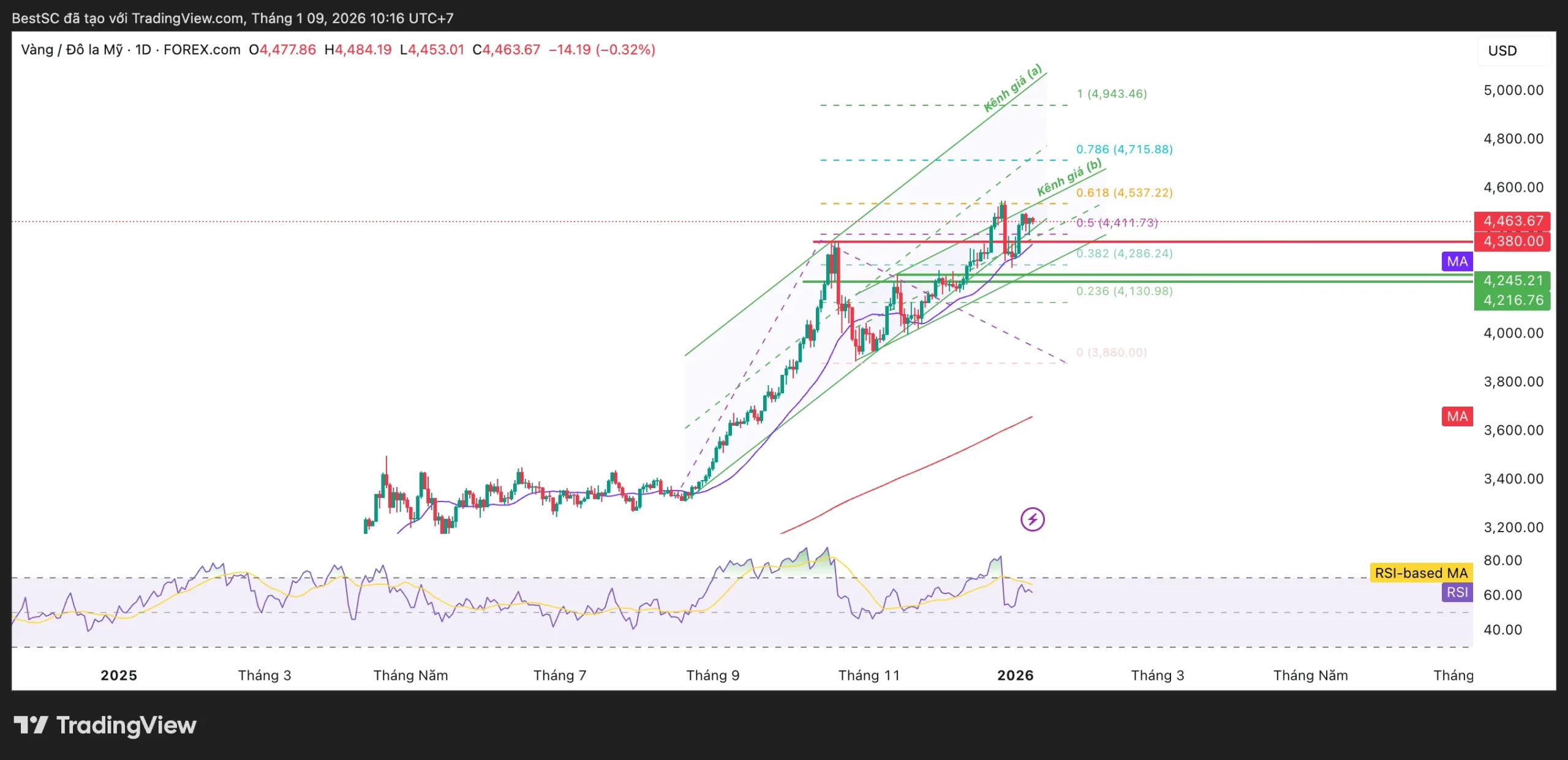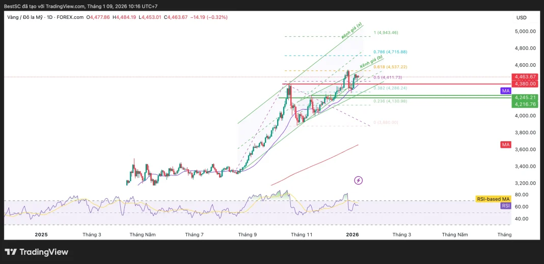 Ở phía trên, vùng 4.540 – 4.580 USD đang đóng vai trò kháng cự gần. Nếu giá đóng cửa dứt khoát phía trên khu vực này, thị trường sẽ xác nhận thoát khỏi trạng thái tích lũy hiện tại và mở ra một chu kỳ tăng mới, với mục tiêu tiếp theo hướng về 4.700 – 4.750 USD, xa hơn là vùng 4.900 – 5.000 USD theo trục kênh giá trung hạn.