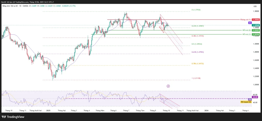 - Entry: khi đóng nến D1 vượt lên và giữ trên ~1.350–1.352 (thoát kênh giảm + vượt MA).