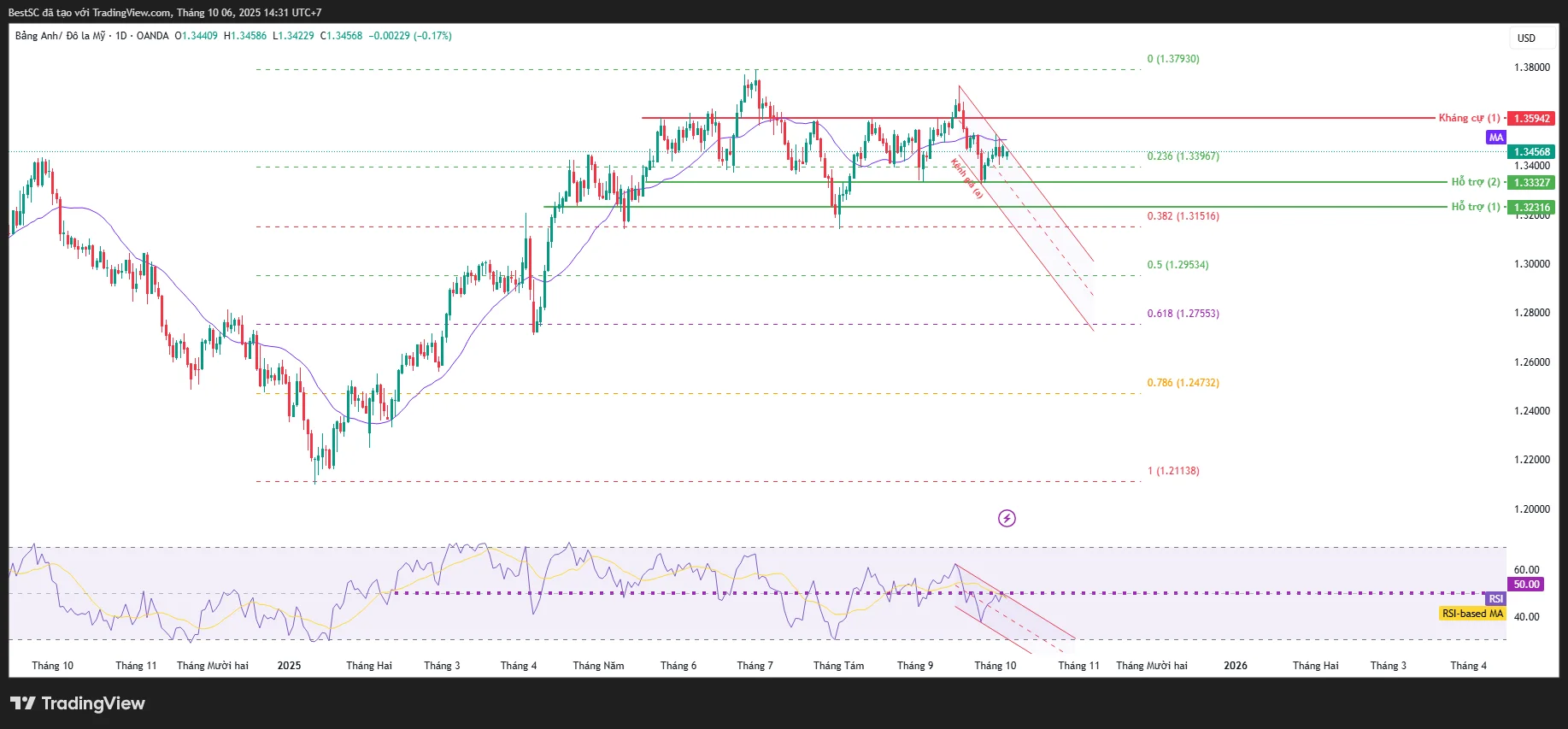 - RSI đang duy trì dưới 50 và nằm trong kênh giảm → biểu hiện của nhịp điều chỉnh; chưa có phân kỳ tăng rõ rệt.