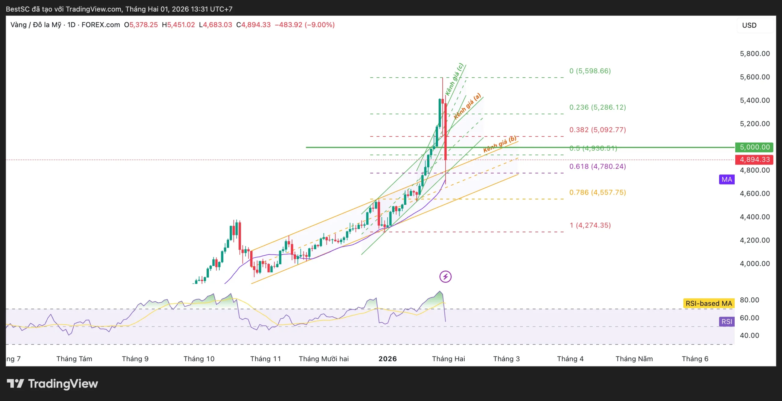 • Vùng Entry: 4.760 – 4.800 USD (Fibo 0.618)