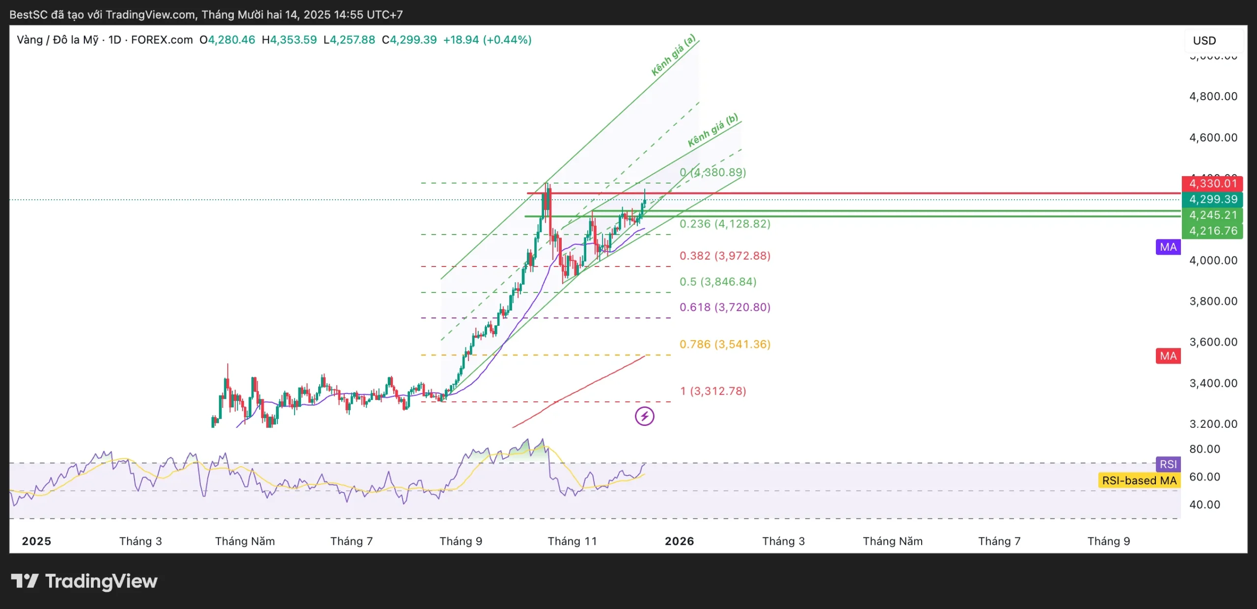 - 4.380–4.400 USD/ ounce: vùng mở rộng theo kênh giá tăng và Fibonacci mở rộng.