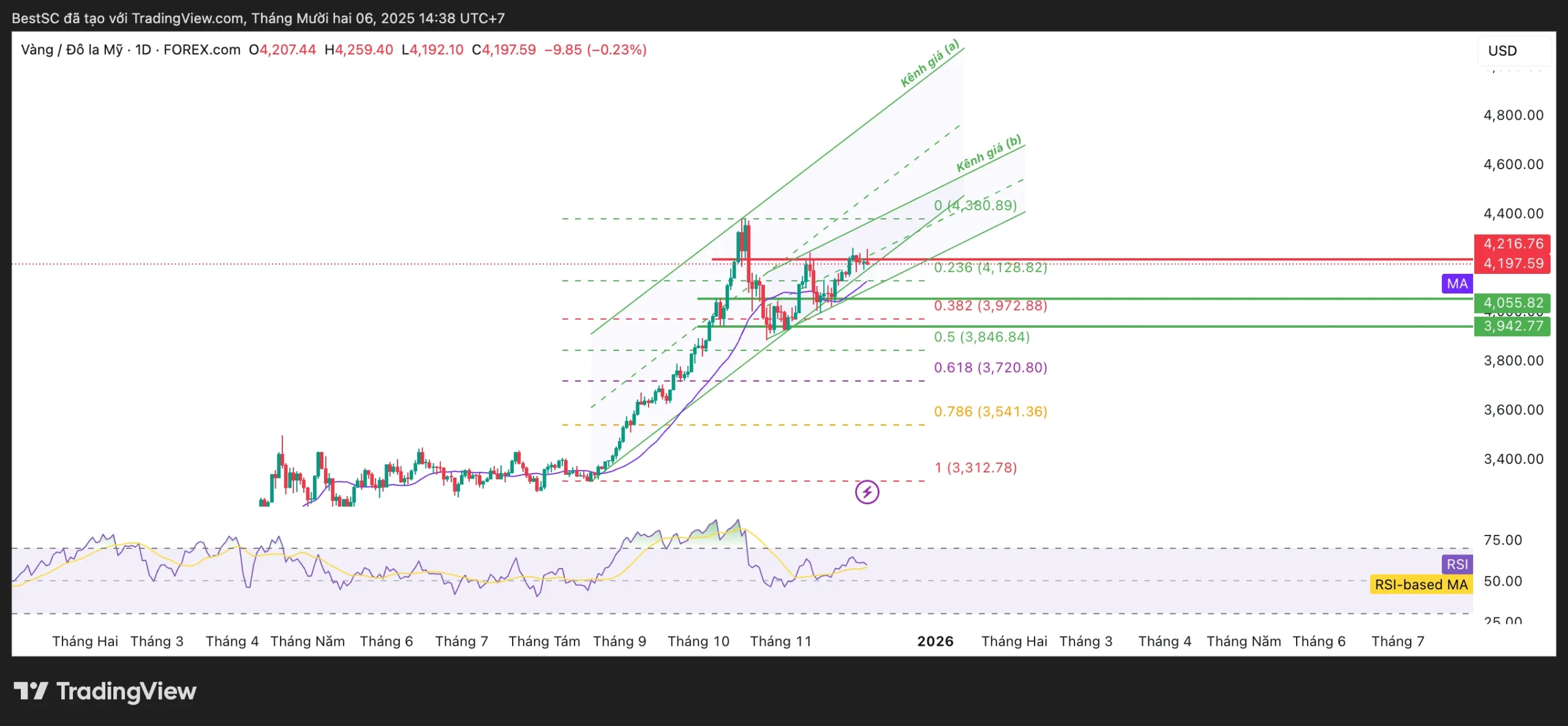 Tổng hợp cấu trúc giá, hỗ trợ động, hành vi RSI, vàng vẫn nằm trong pha tăng bền vững, dù các nhịp lùi kỹ thuật là bình thường và không làm thay đổi xu hướng.