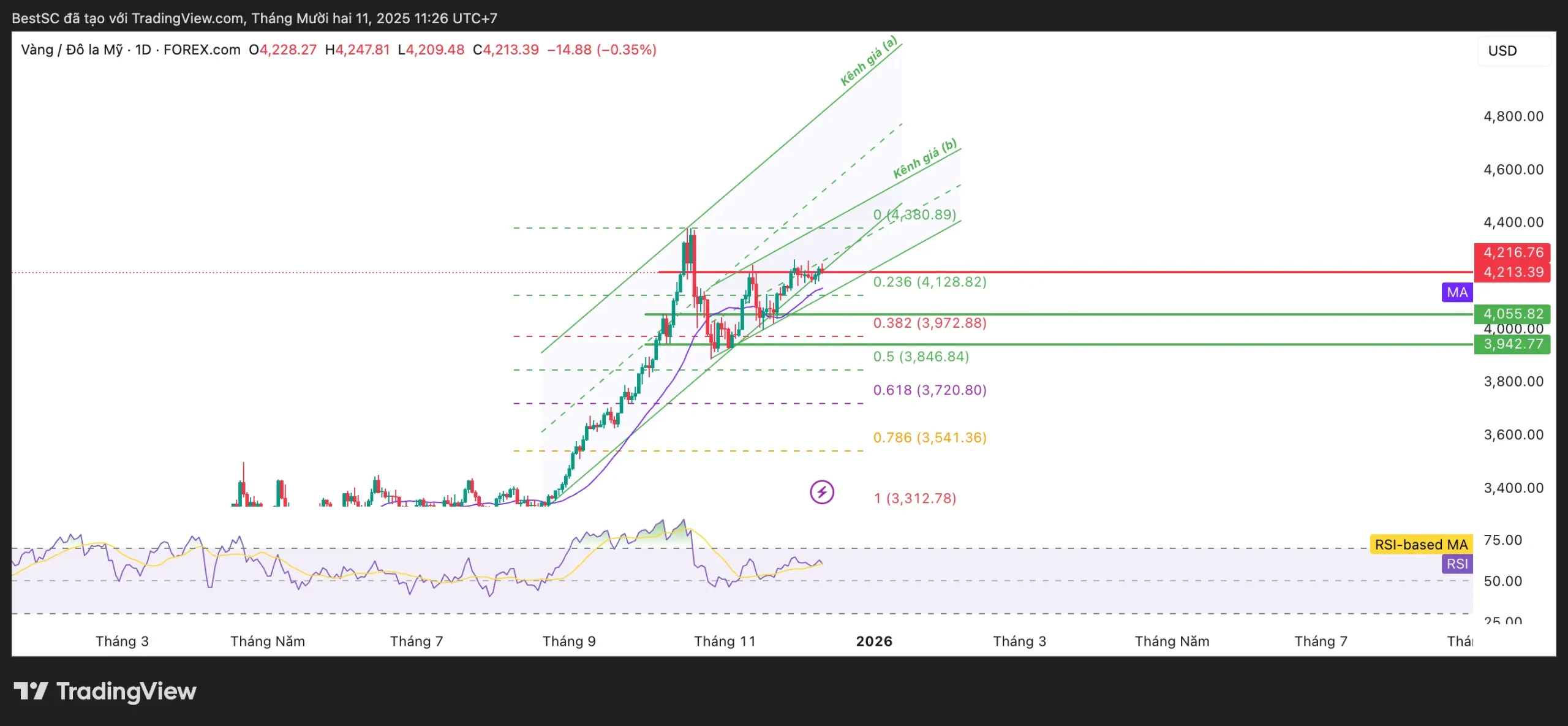 Điều kiện kỹ thuật cho một chu kỳ tăng mới: Vàng cần giữ vững trên 4.128USD và bật tăng trở lại, sau đó phá lên dứt khoát vùng 4.280–4.300USD. Nếu hoàn thành, mục tiêu mở rộng nằm trong kênh giá a, hướng vùng 4.380–4.420USD.