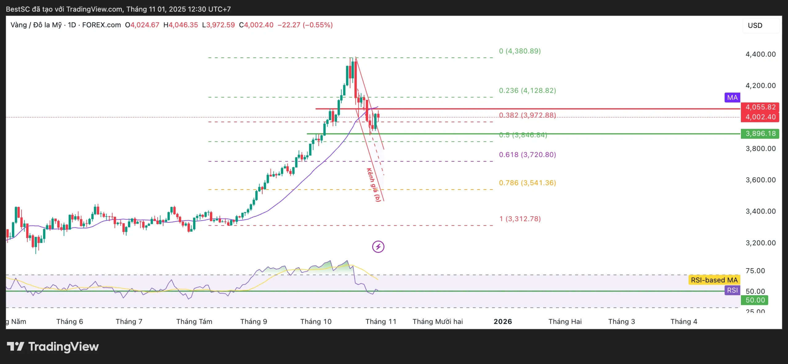 Giá vàng đang dao động quanh ngưỡng 4.000 USD/ ounce, sau khi hồi phục nhẹ từ vùng hỗ trợ Fibonacci 0.382 tại 3.972 USD/ ounce. Đà giảm gần đây vẫn nằm trong kênh điều chỉnh ngắn hạn (kênh giá b), nhưng lực bán đã chững lại khi RSI thoát khỏi vùng quá bán và có dấu hiệu tạo đáy kỹ thuật.