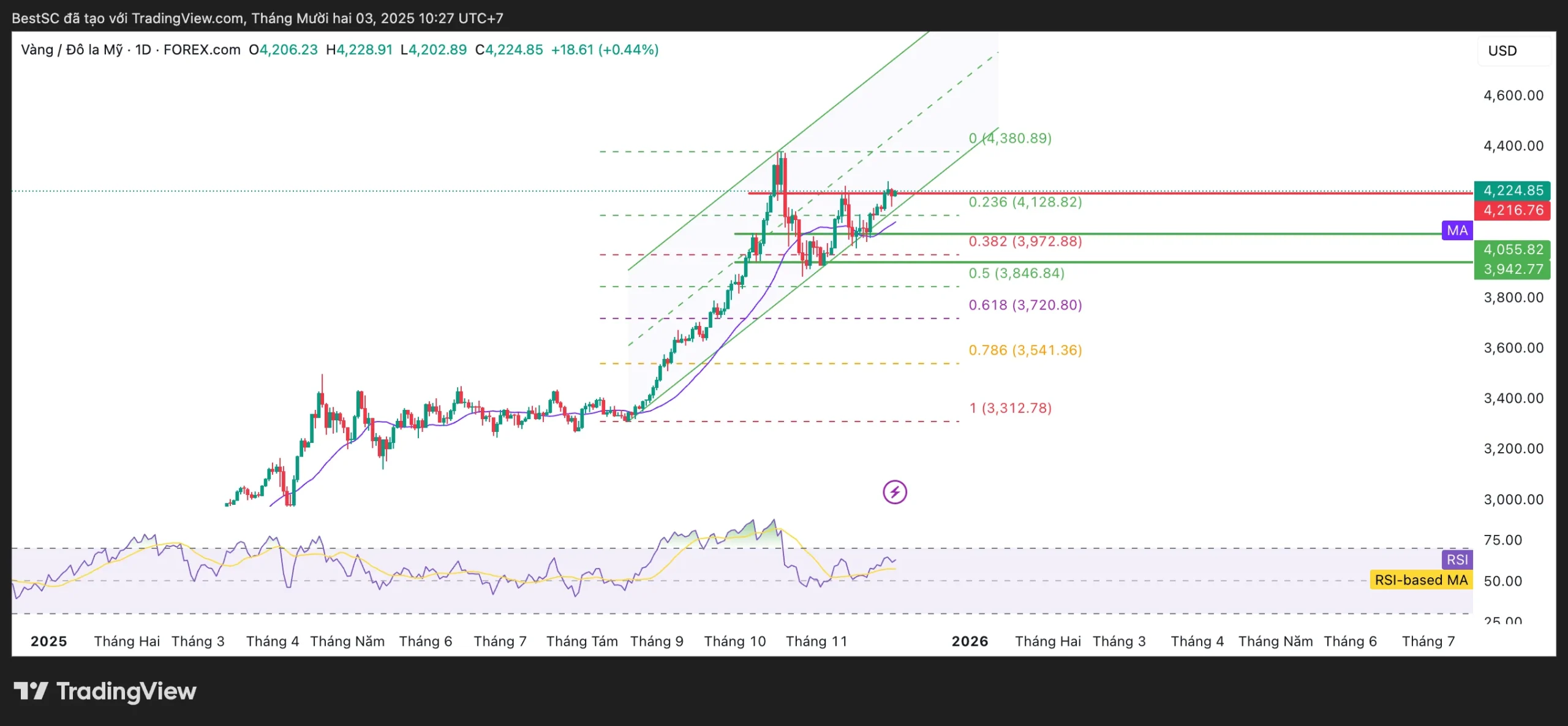 Trong bối cảnh không có cú phá vỡ xuống dưới 3.973 USD/ ounce (Fibo 0.382), cấu trúc tăng tiếp tục được củng cố. Mục tiêu kế tiếp của chu kỳ hiện tại hướng về 4.300 – 4.380 USD/ ounce, tương ứng đỉnh kênh tăng và vùng Fibo mở rộng. RSI đang phục hồi từ vùng trung tính, cho thấy đà tăng còn dư địa.