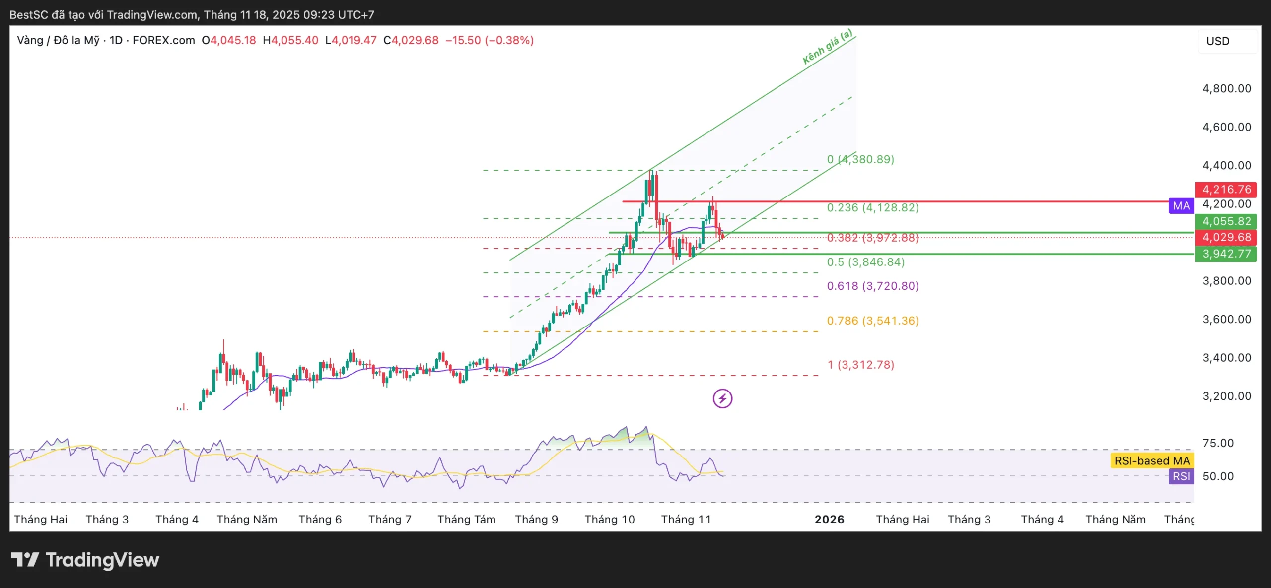Giá hiện đang kiểm định lại đường biên dưới của kênh tăng trung hạn, đồng thời bám sát vùng Fibonacci 0,382 tại 3.972–3.988. Đây là vùng hỗ trợ quan trọng, nếu bị phá vỡ có thể mở ra nhịp điều chỉnh sâu hơn về 3.946–3.950USD (hỗ trợ nằm ngay trên Fib 0,5) và sau đó là 3.846 (Fib 0,5 chuẩn).