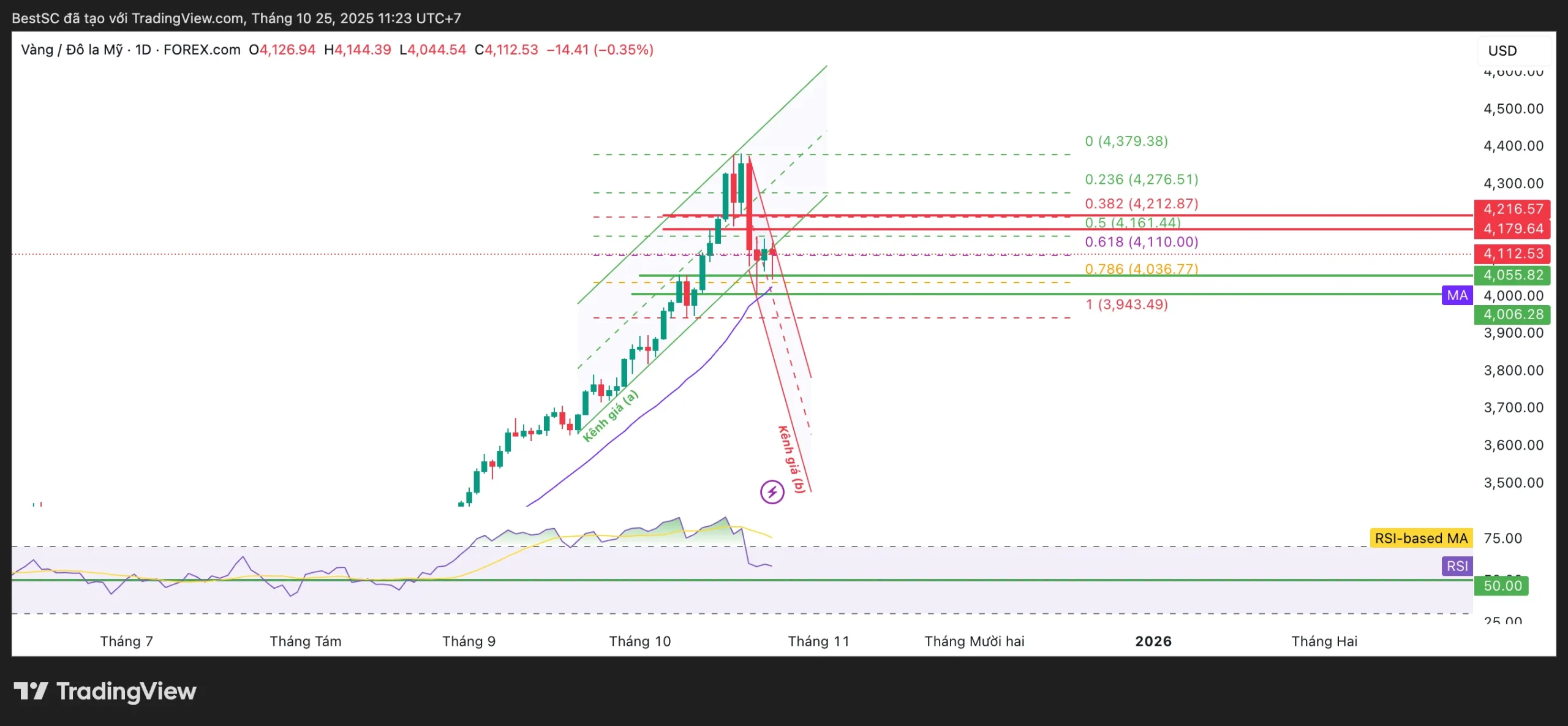 Trên đồ thị ngày, vàng đang trong pha phục hồi kỹ thuật sau nhịp điều chỉnh mạnh từ đỉnh 4.379 USD/ ounce. Hiện giá dao động quanh 4.110 – 4.120 USD, tương ứng vùng Fibonacci 0.618, đồng thời trùng với vùng hỗ trợ động MA21 (4.055 – 4.060 USD), một mốc cân bằng quan trọng giữa lực mua và bán.