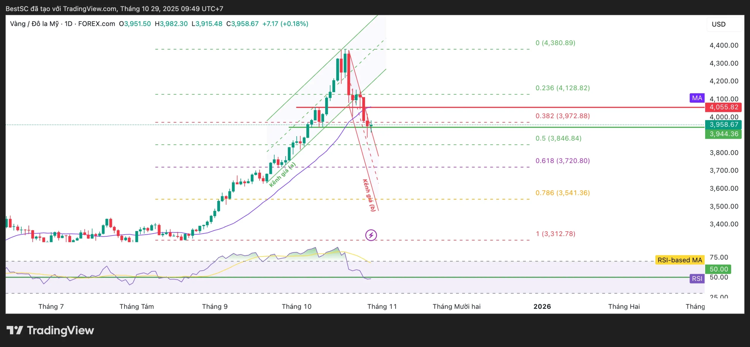 Biểu đồ ngày của vàng cho thấy cấu trúc điều chỉnh giảm vẫn chiếm ưu thế sau khi giá phá vỡ kênh tăng (a) và hình thành kênh giảm ngắn hạn (b). Hiện giá dao động quanh 3.958 USD/ ounce, sát vùng hỗ trợ Fibonacci 0,382 (3.972 USD) mốc kỹ thuật quan trọng đang chuyển hóa thành kháng cự ngắn hạn.