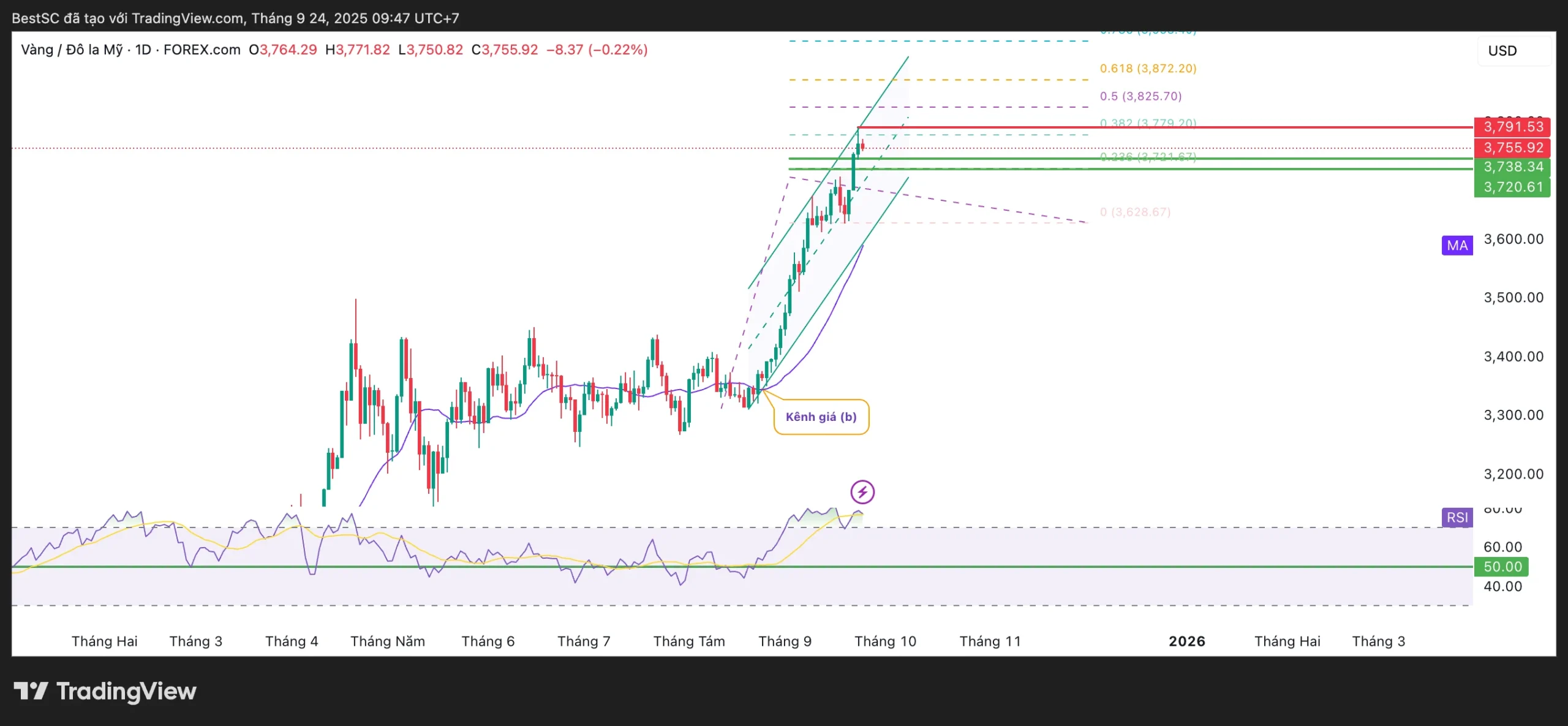 - Mục tiêu kế tiếp: 3.825 USD (Fibo 0.5) → 3.872 USD (Fibo 0.618). Nếu bứt phá thành công, khả năng tiến lên vùng 3.939 USD vẫn mở.
