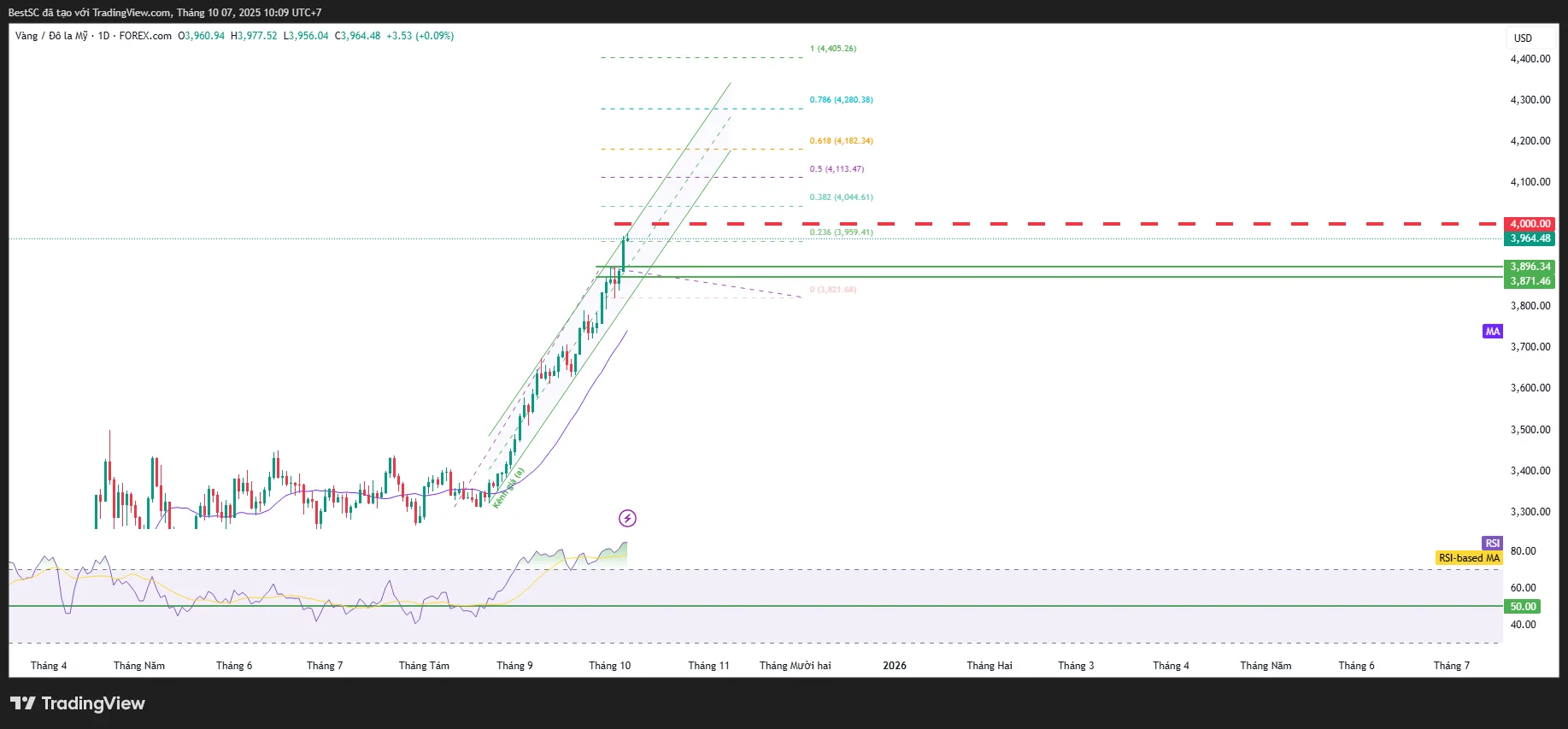 - Kháng cự mạnh: 4.000 USD/oz, đây là ngưỡng tâm lý lớn, cũng trùng vùng Fibonacci 0.236.