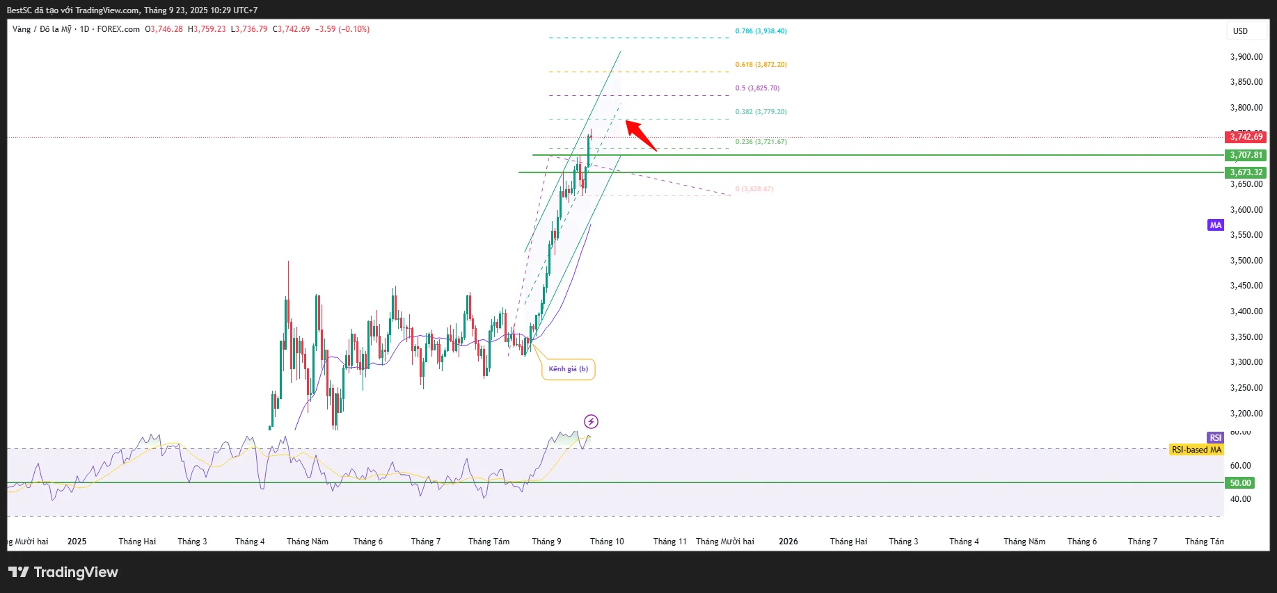 Kháng cự gần nhất: 3.779 USD (mốc Fibonacci 0.382). Nếu phá vỡ được, vàng có thể hướng tới: 3.825 USD (Fib 0.5), 3.872 USD (Fib 0.618), xa hơn: 3.938 USD (Fib 0.786).