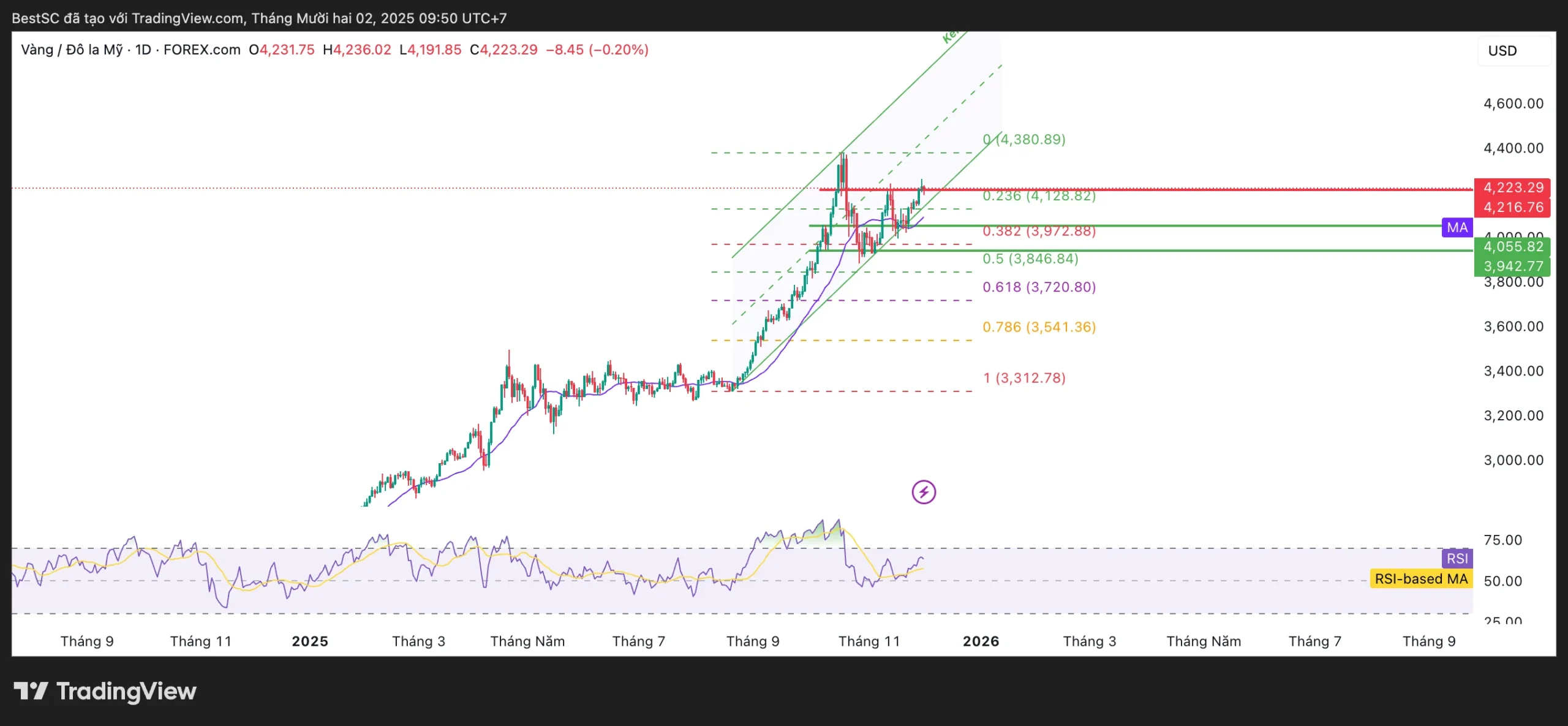 • 4.380 – 4.390 USD (Fib mở rộng + cận trên kênh tăng): mục tiêu tăng kế tiếp nếu giá giữ vững trên vùng 4.128USD.