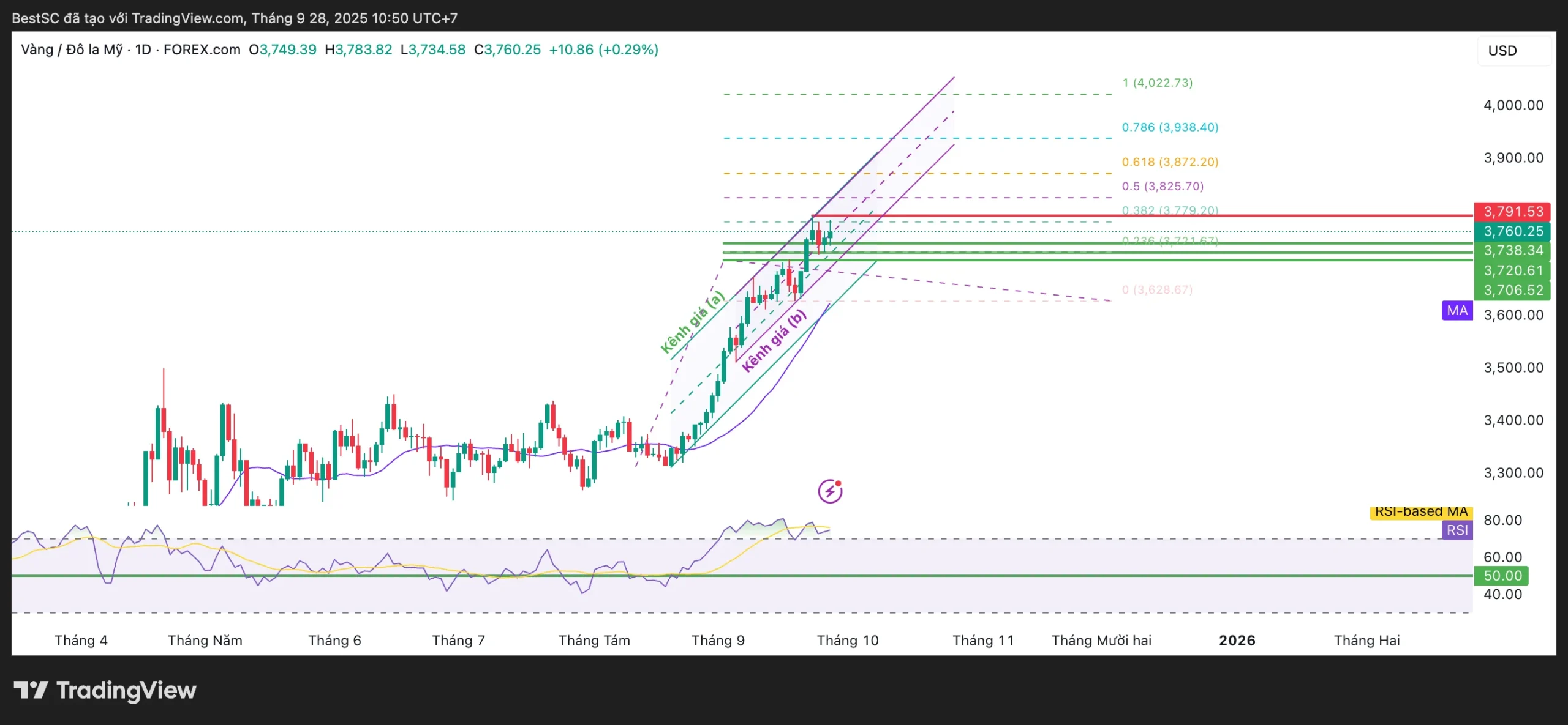 - Kháng cự/ mục tiêu kỹ thuật: ngưỡng kháng cự trước mắt ~3.791 USD (đỉnh gần nhất). Các mục tiêu Fibonacci nếu phá qua: 3.825 (0.5) → 3.872 (0.618) → 3.938 (0.786) → mở rộng đến ~4.022 (extension).